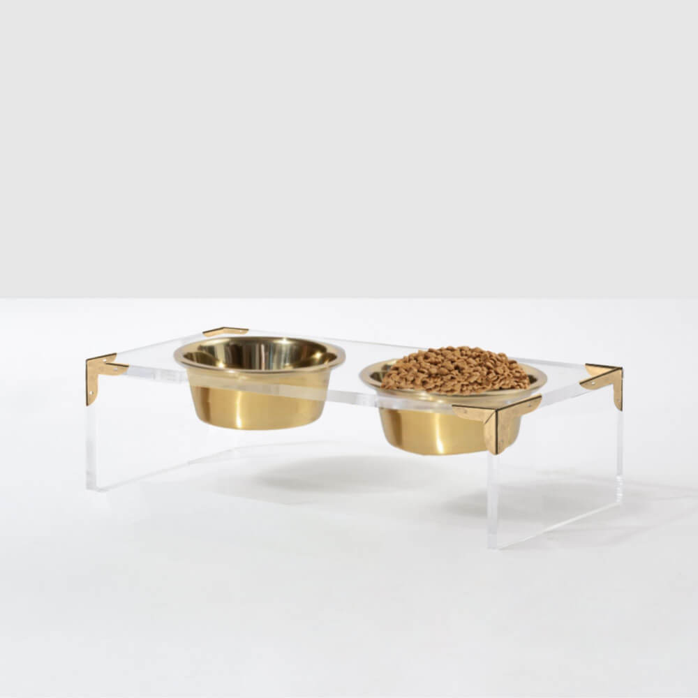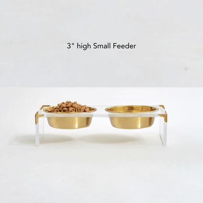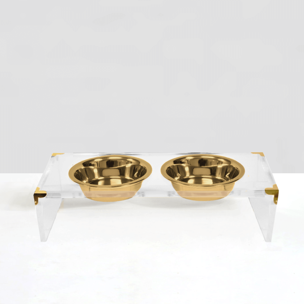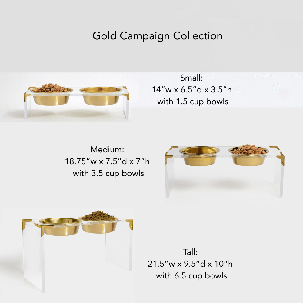For those who want a little glam in their life, meet our Campaign Corners Gold Feeder. Designed with solid 3/8" thick acrylic and stylish gold accents, this lucite feeder offers style and function. The raised design provides an ergonomically correct eating position while the acrylic and brass metal bring the glamour. Our exclusive metal bowls are stainless steel gold powder coated, lead free and non toxic and come in 3 sizes: