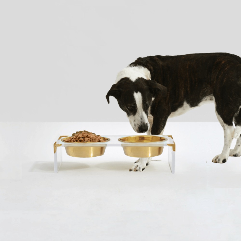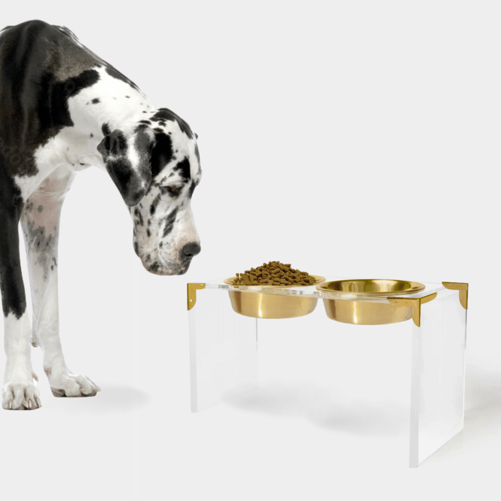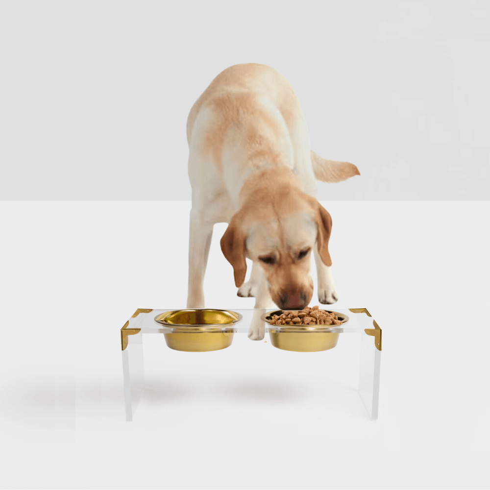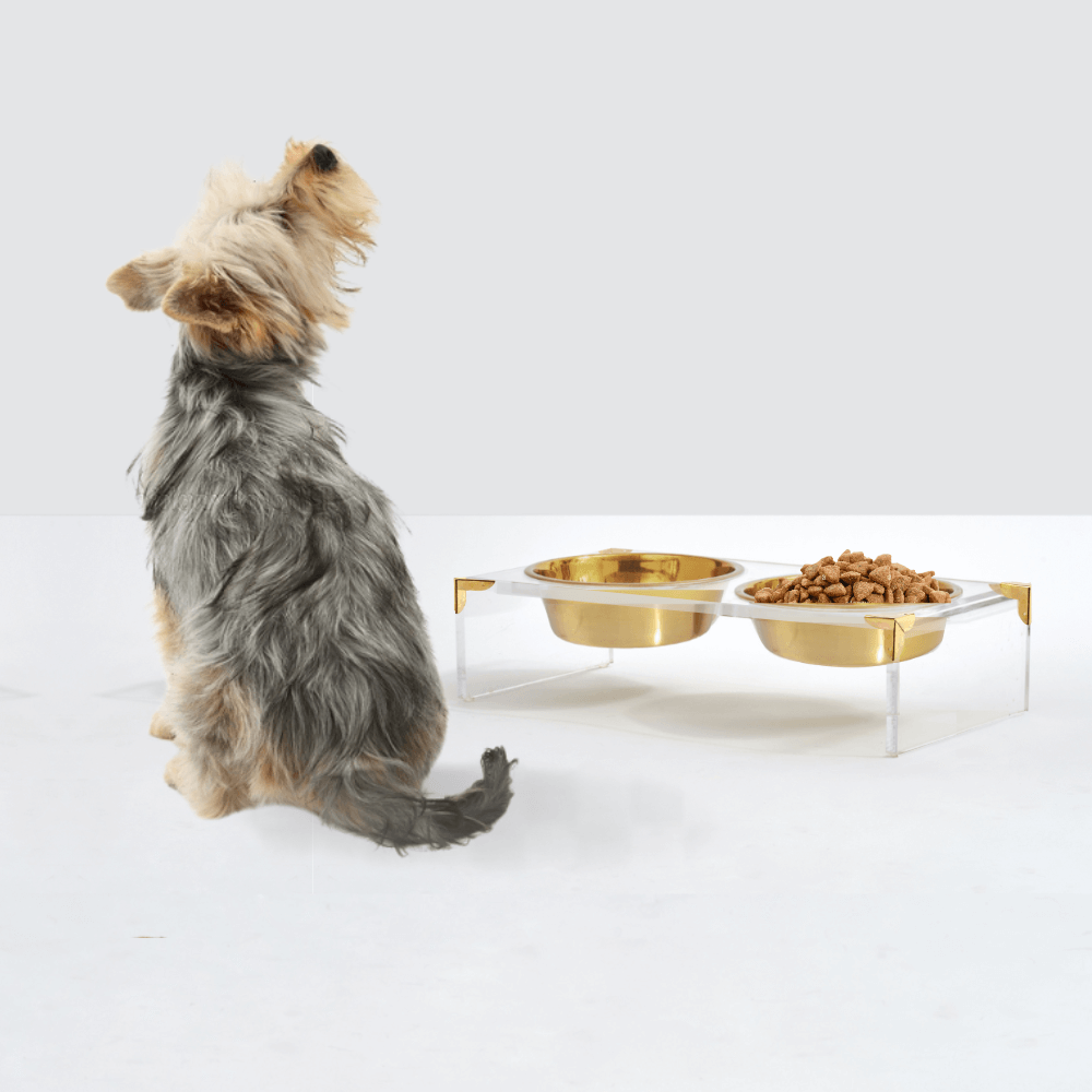 For those who want a little glam in their life, meet our Campaign Corners Gold Feeder. Designed with solid 3/8" thick acrylic and stylish gold accents, this lucite feeder offers style and function. The raised design provides an ergonomically correct eating position while the acrylic and brass metal bring the glamour. Our exclusive metal bowls are stainless steel gold powder coated, lead free and non toxic and come in 3 sizes: