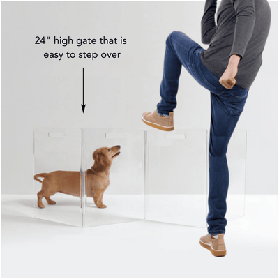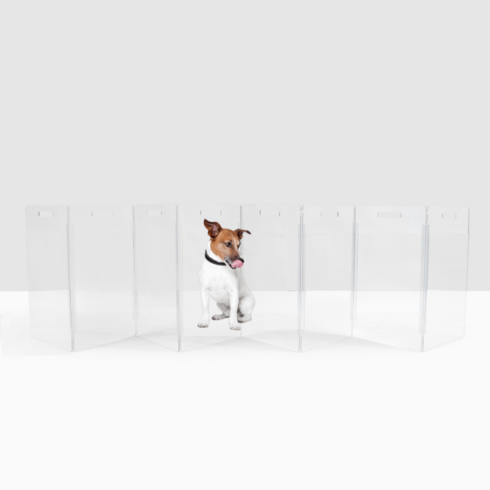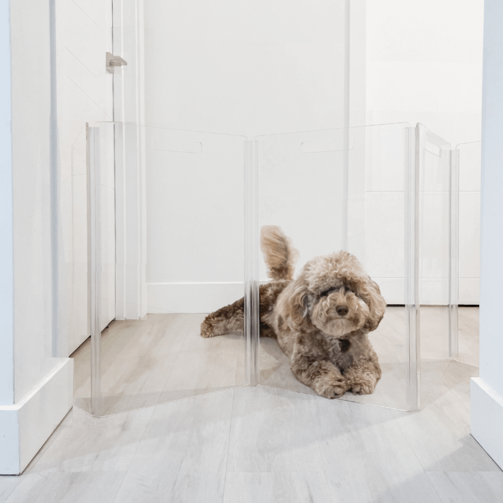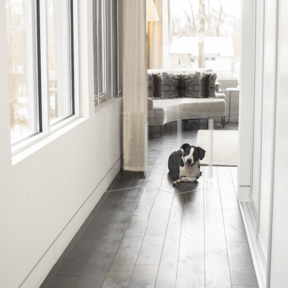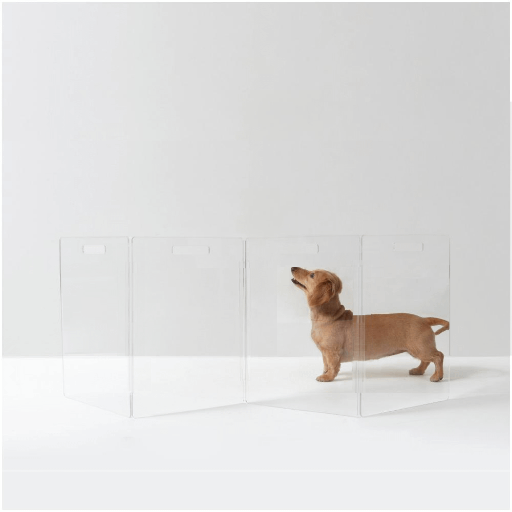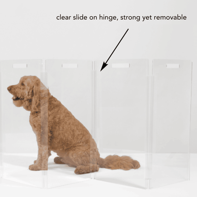 Clear Lucite pet products reduce pet anxiety because your pet has a clear view of you and the rest of the house.