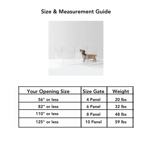 Here is how to choose your gate size; the 4 Panel is for openings 56" or less; the 6 Panel is for openings 82" or less; the 8 Panel is for openings 110" or less and the 10 Panel is for openings 125" or less. Because it is 24" high, it is perfect for small and medium size dogs and is easy to step over.