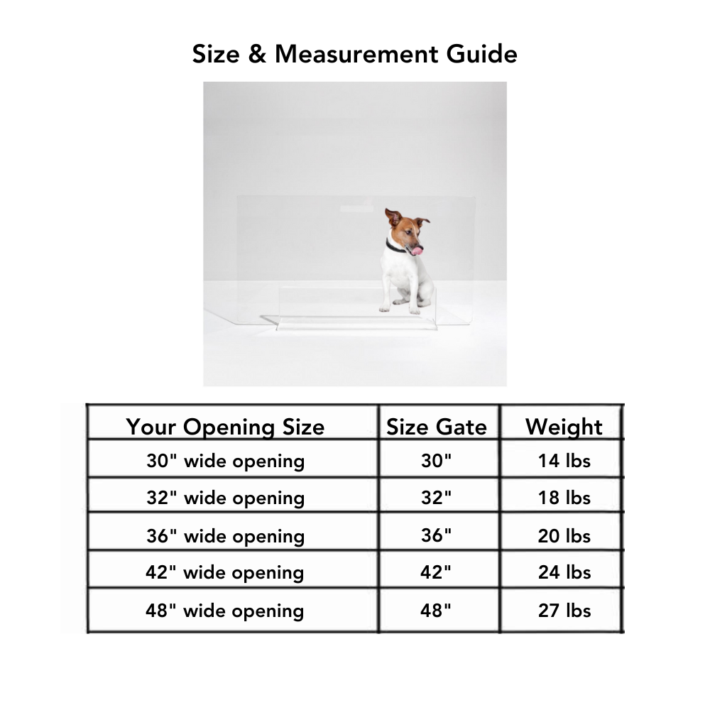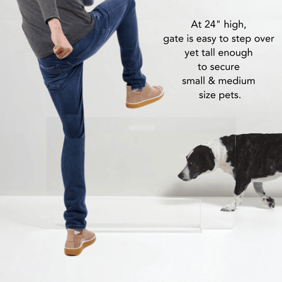 Our Low Clear Pet Gate Panel is a clean, modern freestanding pet gate for openings 48" or less. Based on the success of our standard view panel gate, we've designed a lower, 24" high gate perfect for small and medium size dogs. Each gate comes with stick on floor protectors to prevent wood floor scratching. With laser cut handles to maneuver the panel, this freestanding pet gate is pure ease and modernity.