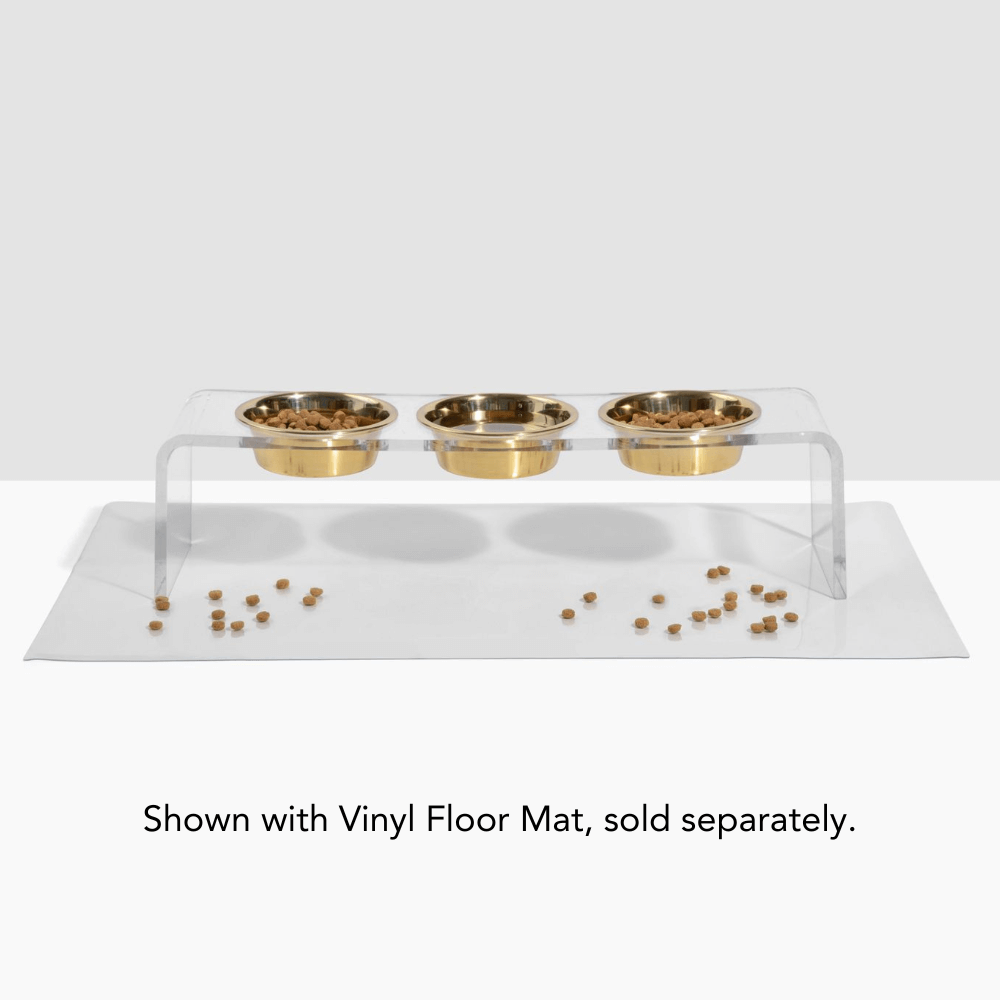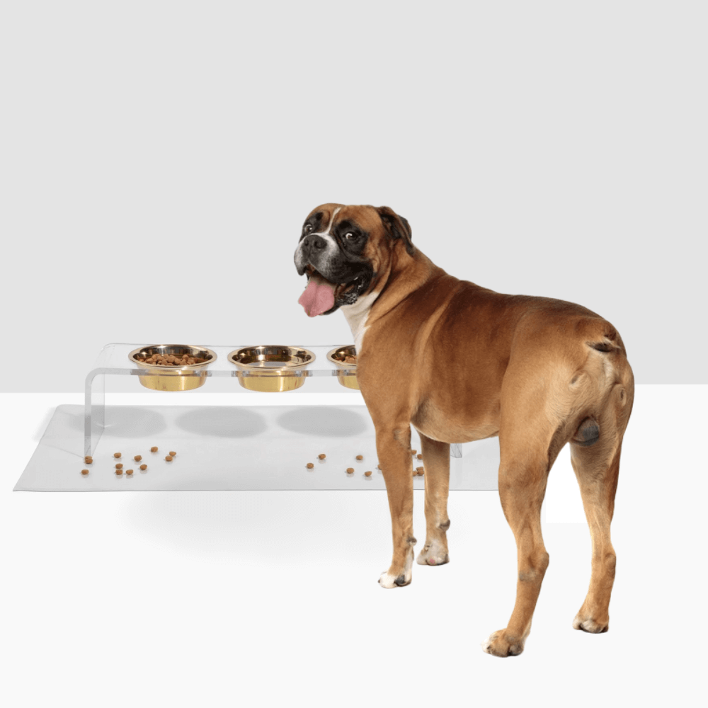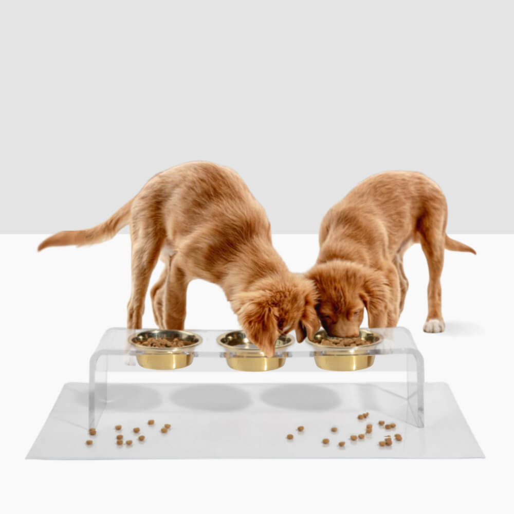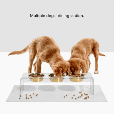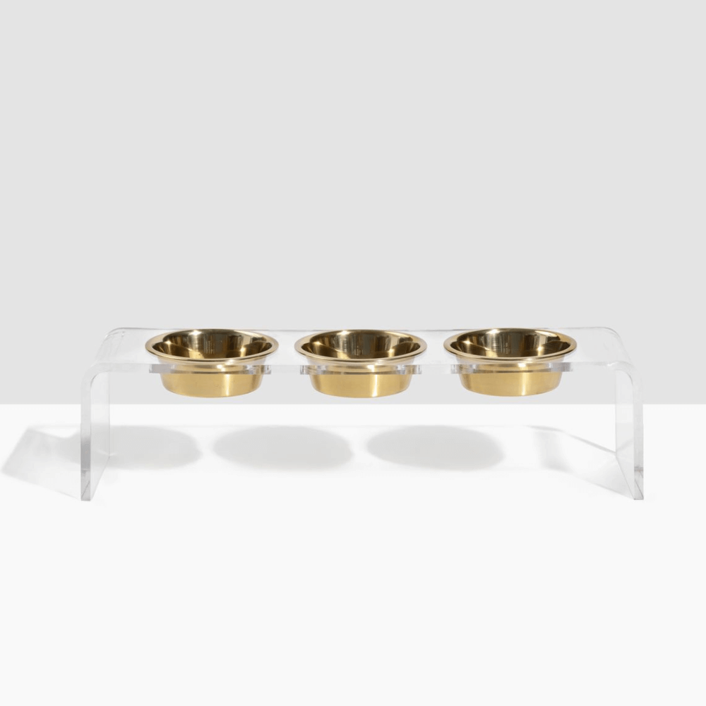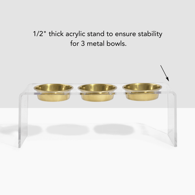 Hiddin's exclusive Medium Triple Dog Bowl Feeder with Gold Bowls is a chic choice for multiple dog dining. The 1/2" thick acrylic provides the strength, while the 7" raised height ensures an ergonomically correct eating position for your pets. Our lucite feeder includes 3 gold powder coated bowls, 3.5 cup or 6.5 cup capacity. The gold bowls are non-toxic, lead free and hand wash only. Clearly, this is the best looking, lucite 3 bowl feeder on the market and is made in the USA, under our watchful eye.