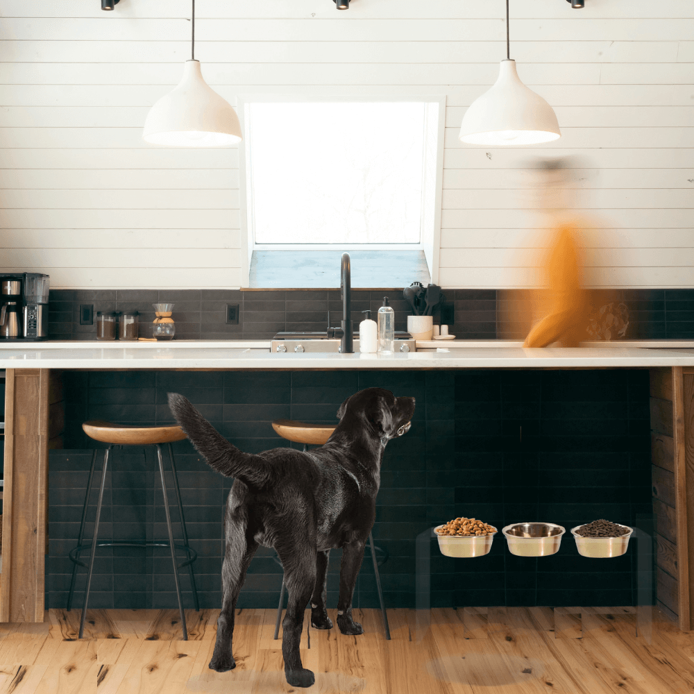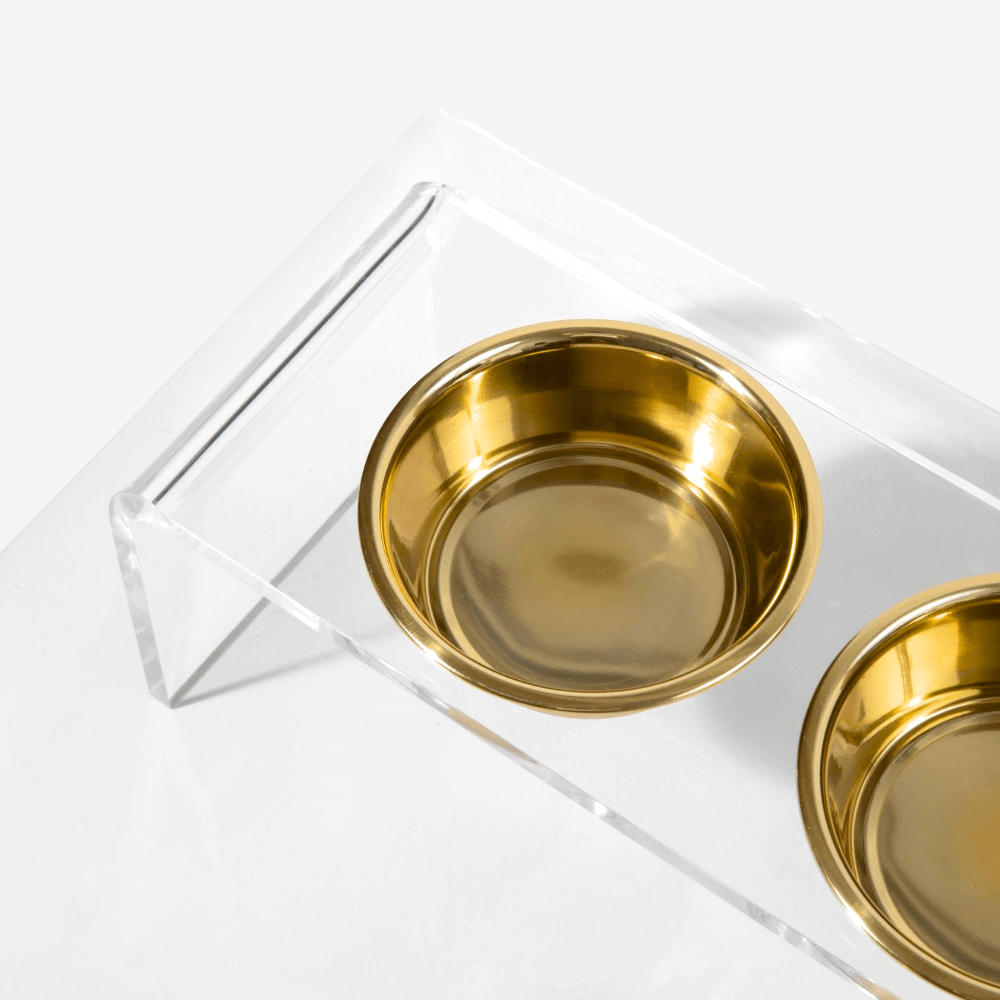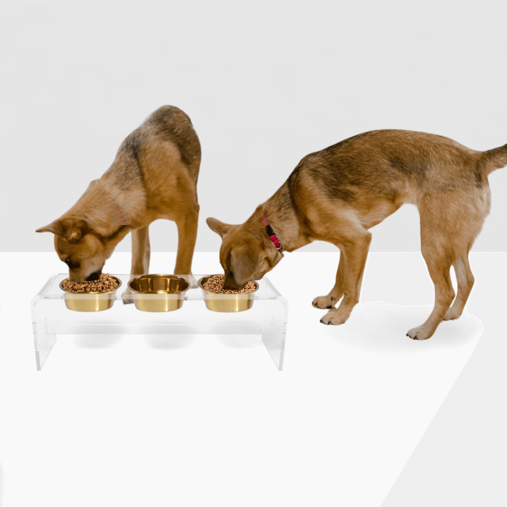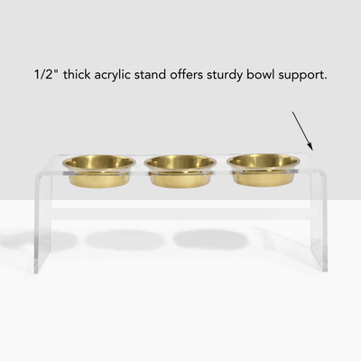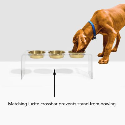 Our Tall Clear Triple Dog Bowl Feeder with Gold Bowls is a chic choice for large dog or multiple dogs' dining. The 1/2" thick acrylic provides the strength, while the 12" height ensures an ergonomically correct eating position for your pet. A practically invisible, matching lucite crossbar ensures stability; depending on the weight of your bowl contents, you can choose to use the stretcher or not. Hiddin's exclusive feeder includes lead free, 2 quart, powder coated, gold finish bowls.