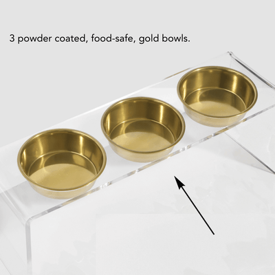-Elegant, 3 bowl lucite feeder with gold powder-coated, metal bowls, 6.5 cup capacity.