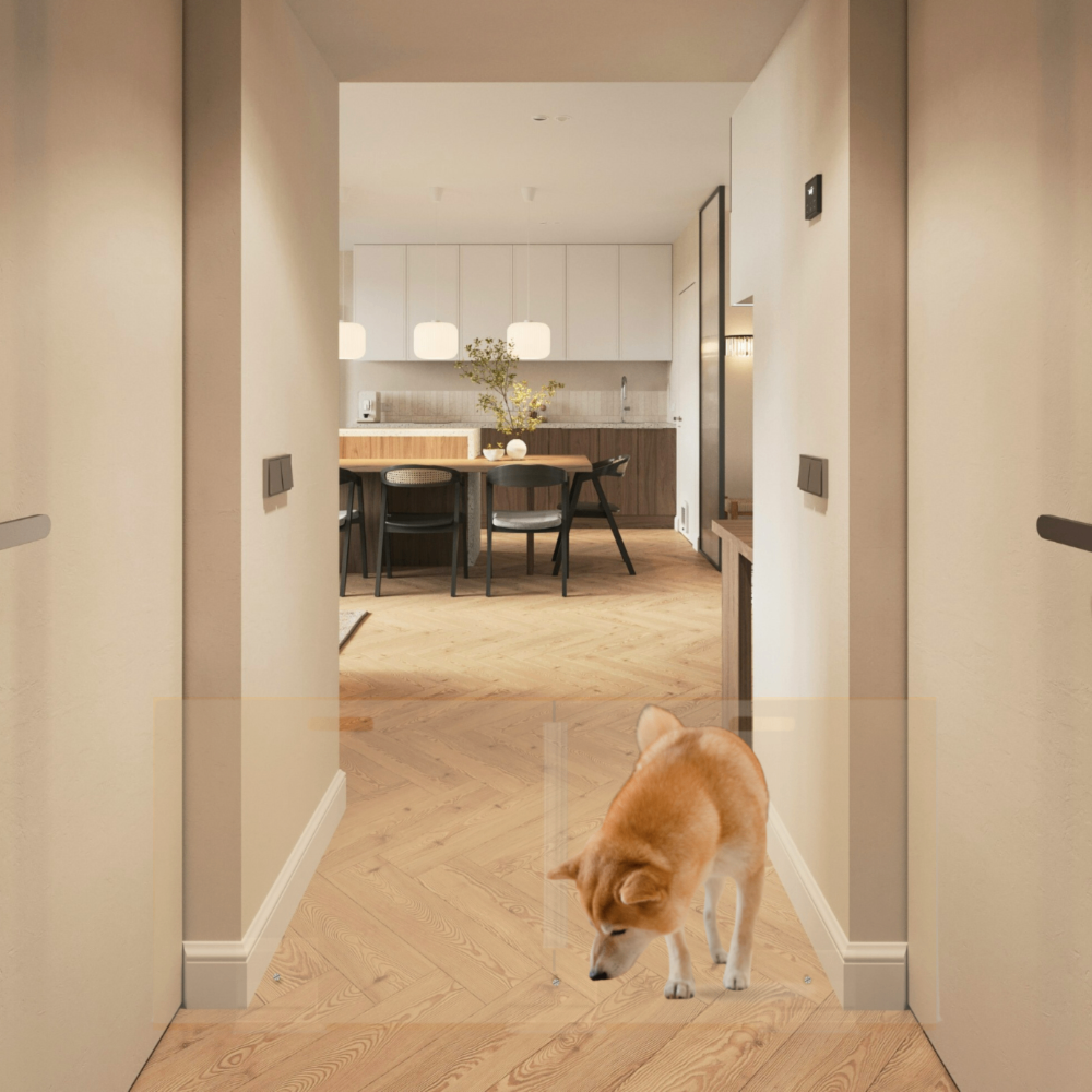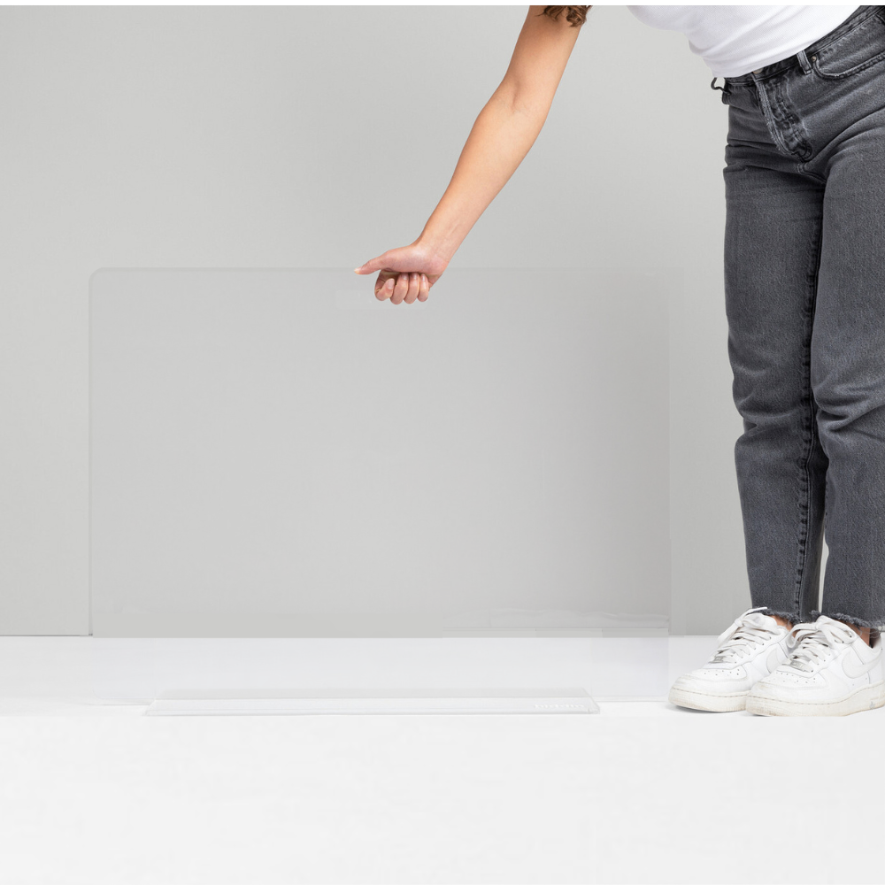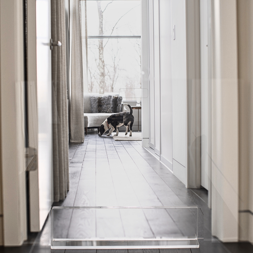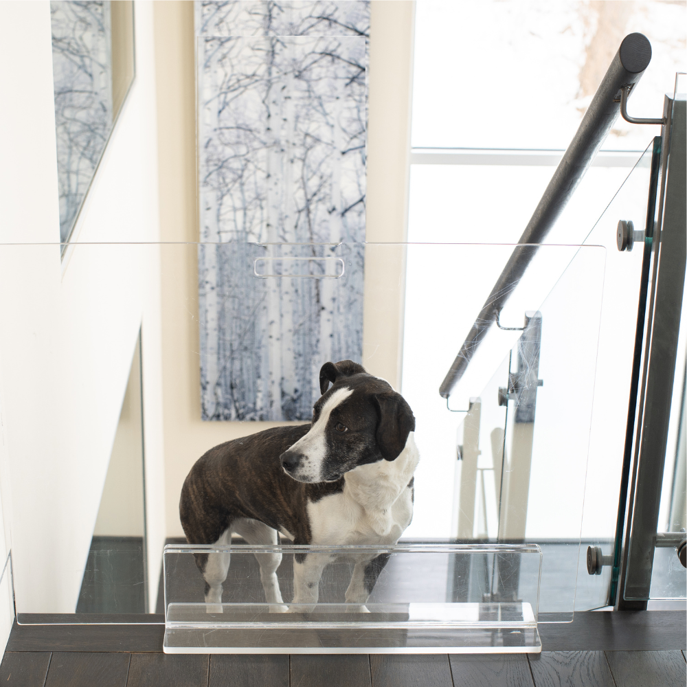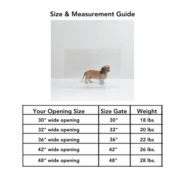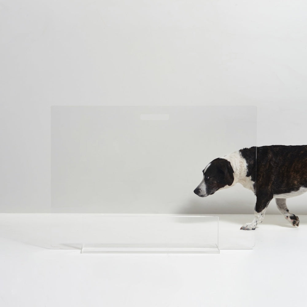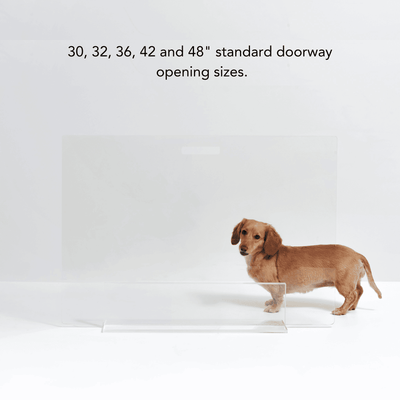 Our Clear Freestanding Pet Gate Panel is a clean, modern freestanding pet gate for openings 48" or less. The 30, 32 and 36" pet gate consists of a 1/4" clear acrylic panel that slides into a 3/8" thick, sturdy base. The larger 42" and 48" panels have (3) lucite feet that screw tight to the panel. With laser cut handles to maneuver the panel, this freestanding pet gate is pure modernity. Each gate comes with stick on floor protectors to prevent wood floor scratching.