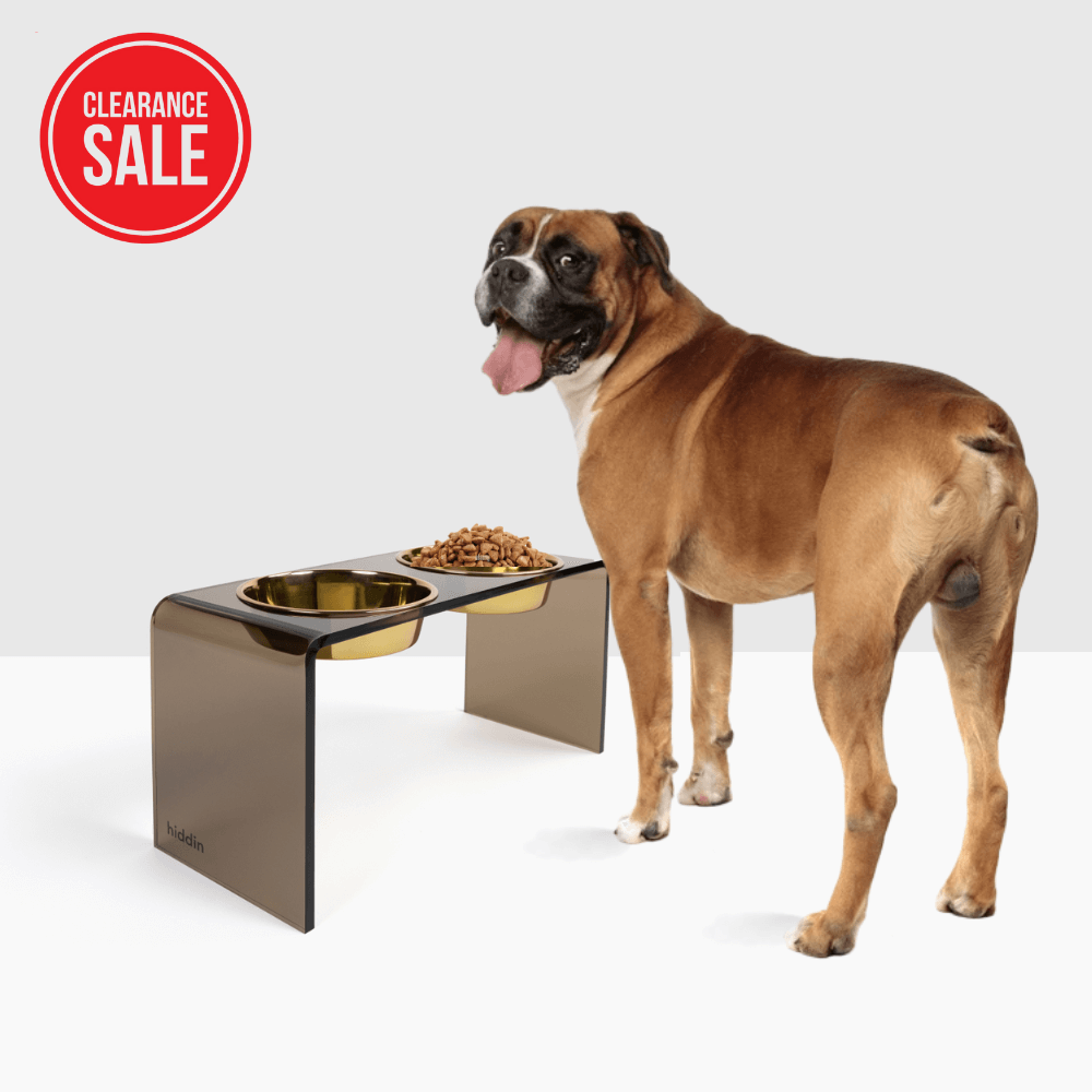 The Hiddin Bronze Feeder Collection consists of modern warm brown lucite combined with our exclusive stainless steel metal bowls. Our raised acrylic feeders provide an ergonomically correct eating position for any size pet and bring a warm, chic brown color to your interior. With a gentle waterfall design, this sheer brown lucite feeder is sturdy and modern. Our exclusive metal bowls are available in stainless steel silver, powder coated gold, black and white. The bowls are non-toxic and weighty, adding shimmer and shine to your decor.