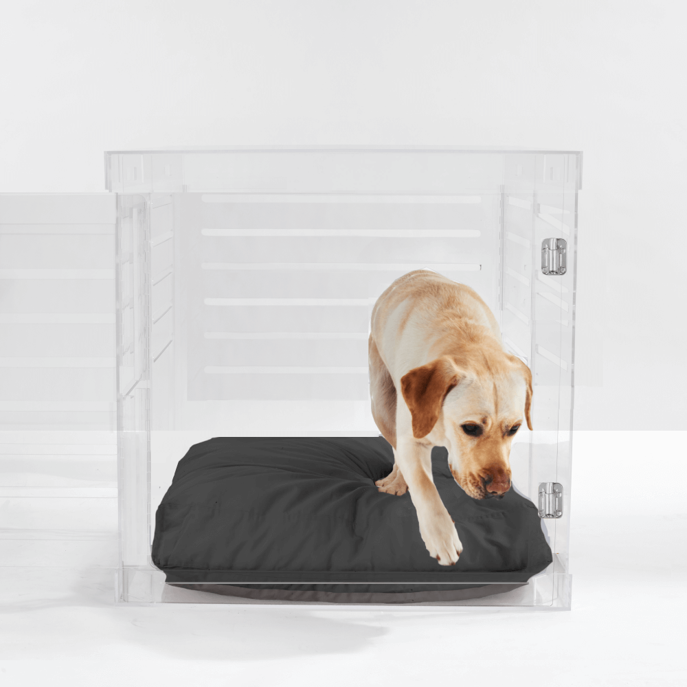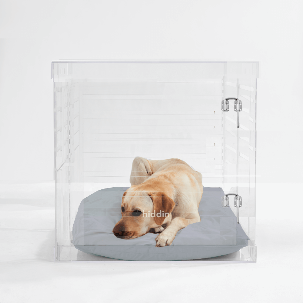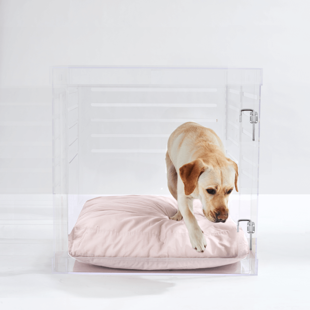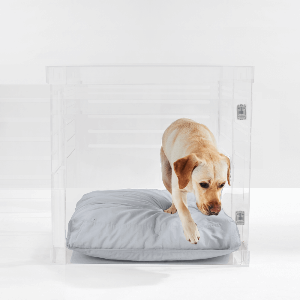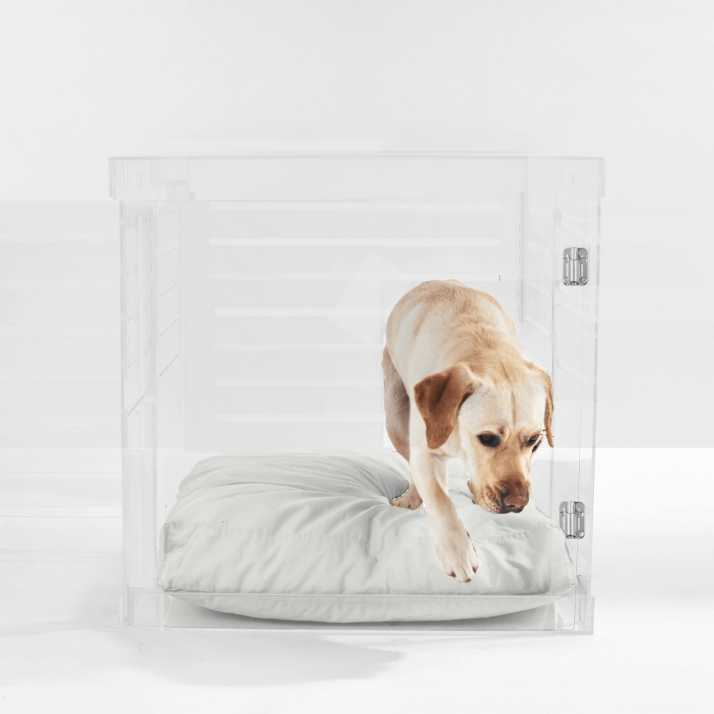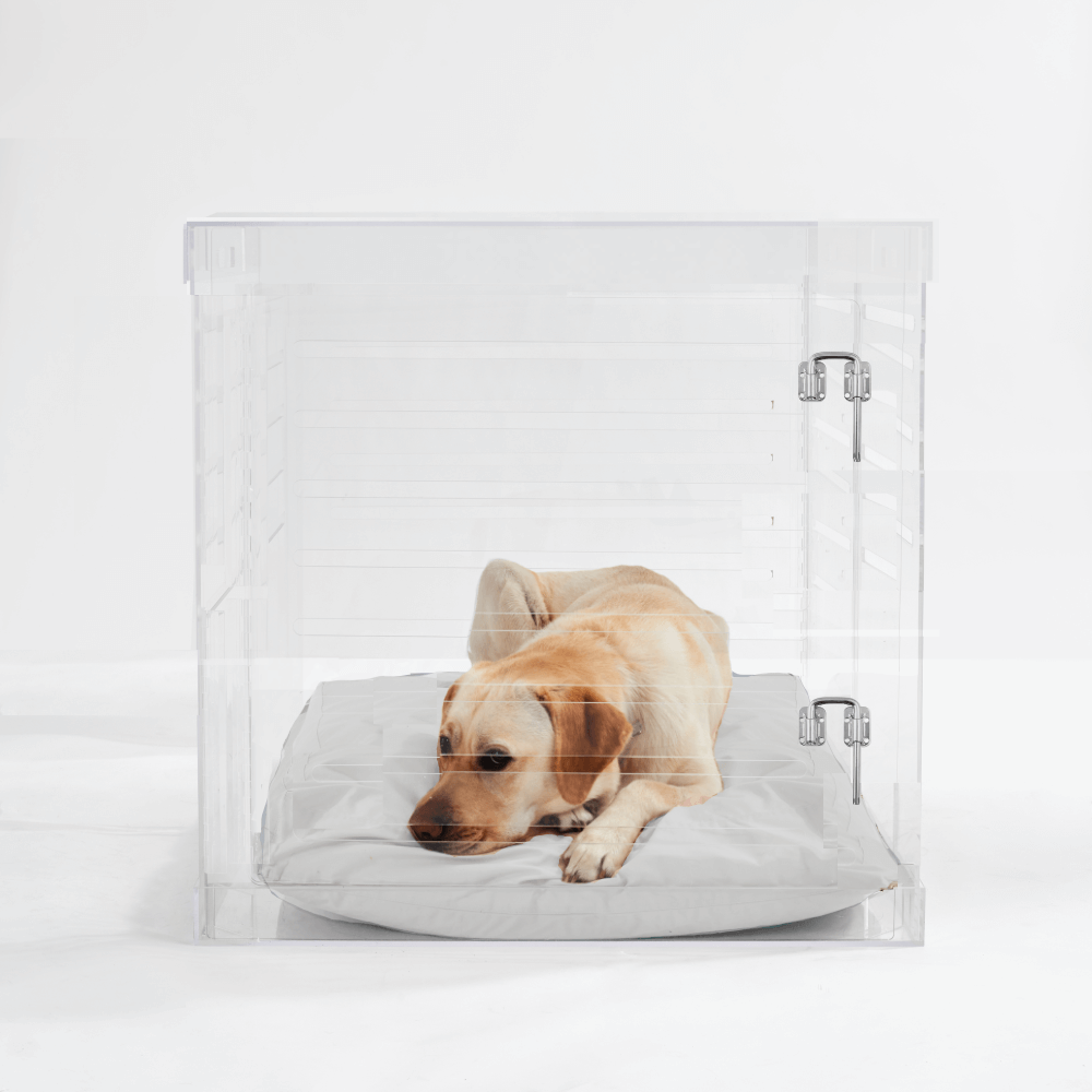Clear Lucite pet products reduce pet anxiety because your pet has a clear view of you and the rest of the house.