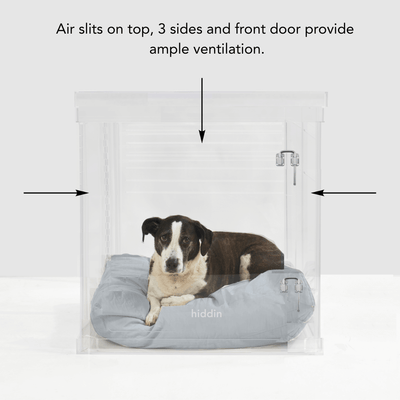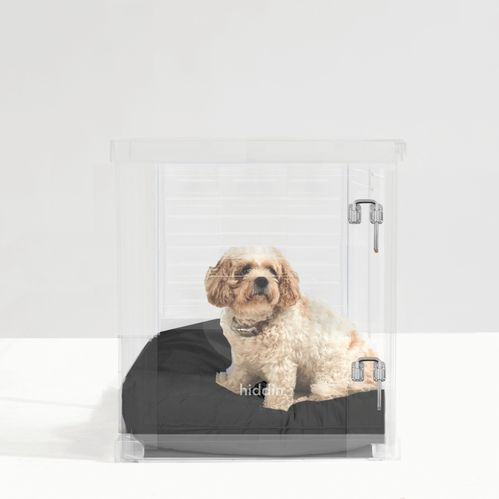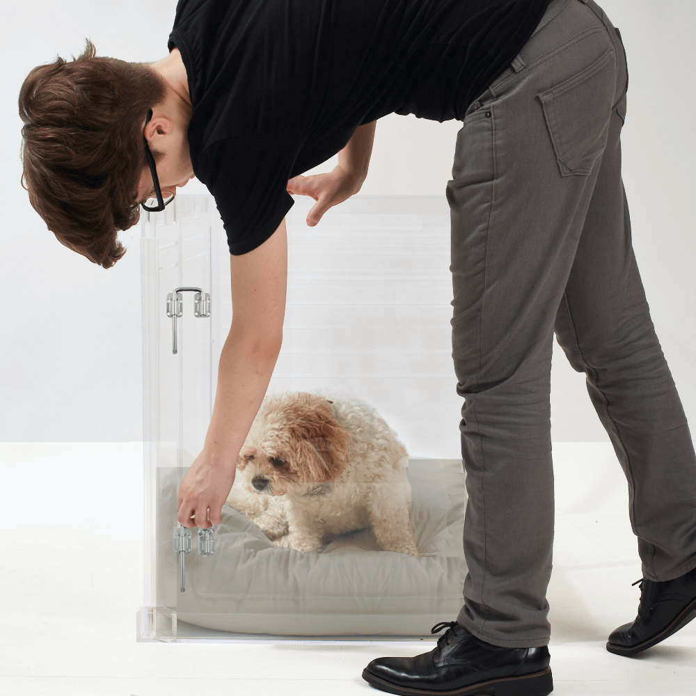 Clear Lucite pet products reduce pet anxiety because your pet has a clear view of you and the rest of the house.