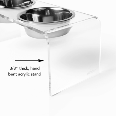 Our Medium Clear Double Pet Feeder with Silver Bowls is a modern 3/8" thick lucite feeding stand with 2 stainless steel metal bowls. Our exclusive stainless steel bowls are lead free, dishwasher safe and non-toxic. The 7" high acrylic feeder provides an ergonomically correct eating position and gives the sleek metal bowls a floating effect. With a gentle waterfall design, this clear lucite pet feeder is sturdy and modern.