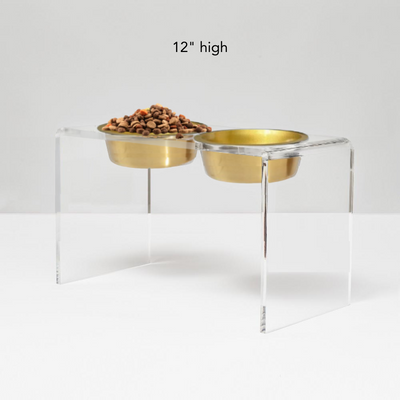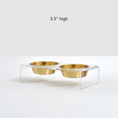 Our Monogram Double Feeder is a modern, thick Lucite pet feeder with 2 lead free, stainless powder coated, gold metal bowls. The exclusive gold metal bowls are non-toxic, food safe and hand wash only. Designed for dogs of all sizes, the Hiddin clear lucite feeders are now available with the option to engrave your pet's name! Just choose one of our 3 favorite fonts and make your lucite feeder special. With a gentle waterfall design, this clear lucite pet feeder is sturdy and modern and blends into any decor. Allow 3 weeks for production....elegance awaits!