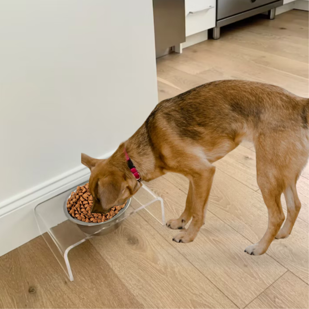 Our Clear Single Pet Bowl Feeder with Silver Bowl is a chic way to feed your pet. The 5" high, raised stand provides an ergonomically correct eating position for your pet and blends seamlessly into any kitchen décor. Hiddin's sturdy metal silver bowl has a 6.5 cup capacity and is dishwasher safe.