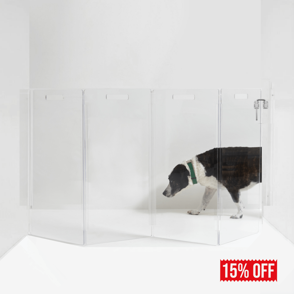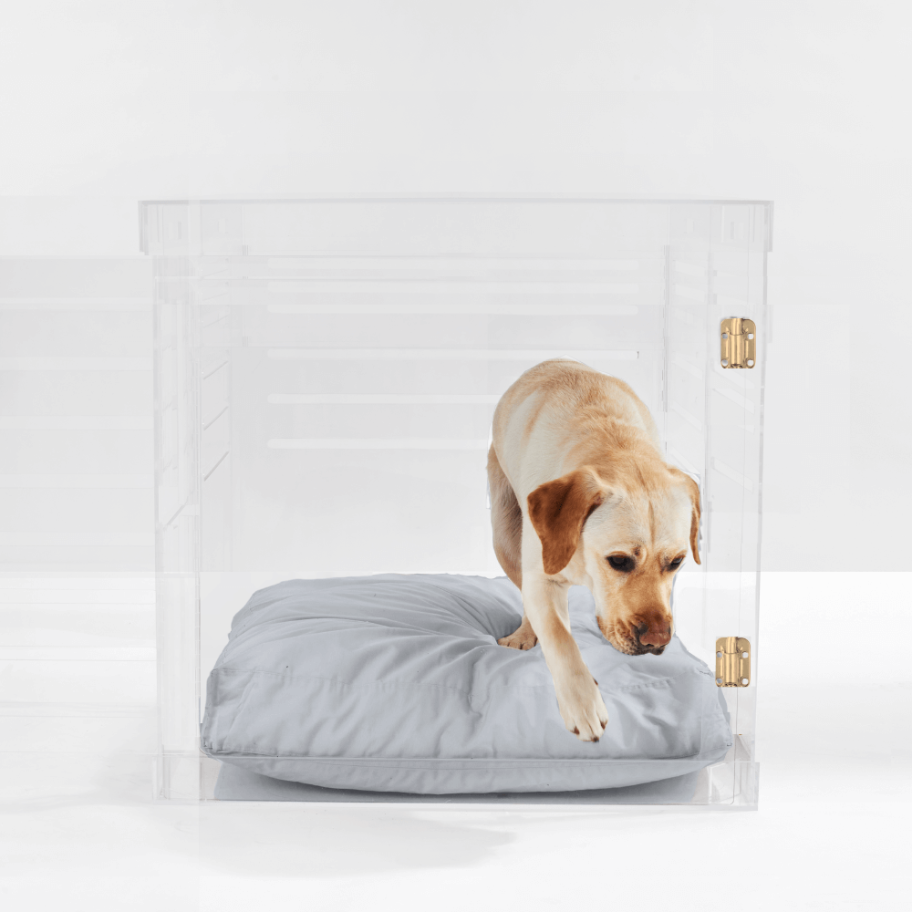 What could be more beautiful than the combination of clear, thick Lucite and shimmering gold metal? Hiddin pet products are designed to follow the latest in interior design trends and gold metal is definitely trending. Check out our clear lucite and gold metal feeders and our clear crates and gates that are available with gold metal latches...so chic!