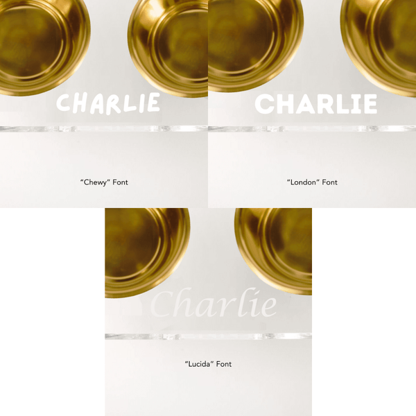 Our Monogram Double Feeder is a modern, thick Lucite pet feeder with 2 lead free, stainless powder coated, gold metal bowls. The exclusive gold metal bowls are non-toxic, food safe and hand wash only. Designed for dogs of all sizes, the Hiddin clear lucite feeders are now available with the option to engrave your pet's name! Just choose one of our 3 favorite fonts and make your lucite feeder special. With a gentle waterfall design, this clear lucite pet feeder is sturdy and modern and blends into any decor. Allow 3 weeks for production....elegance awaits!
