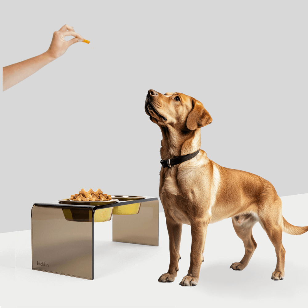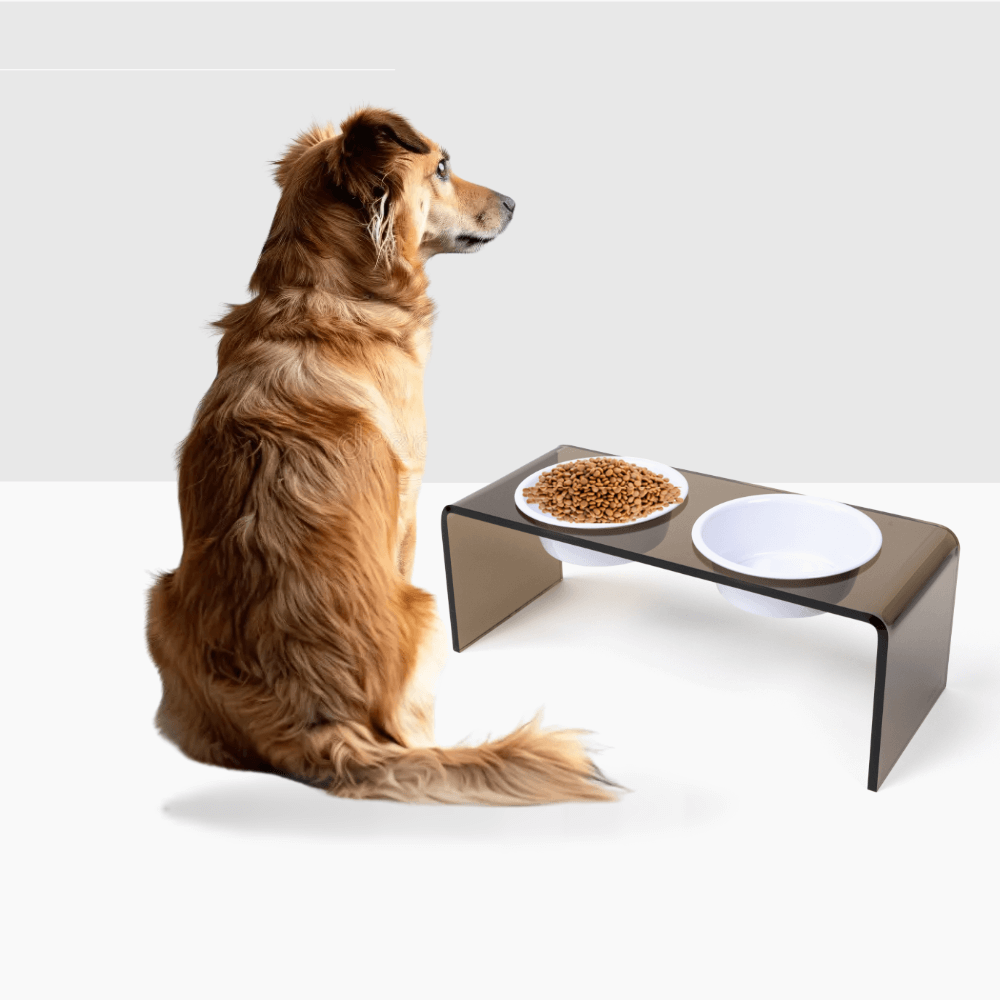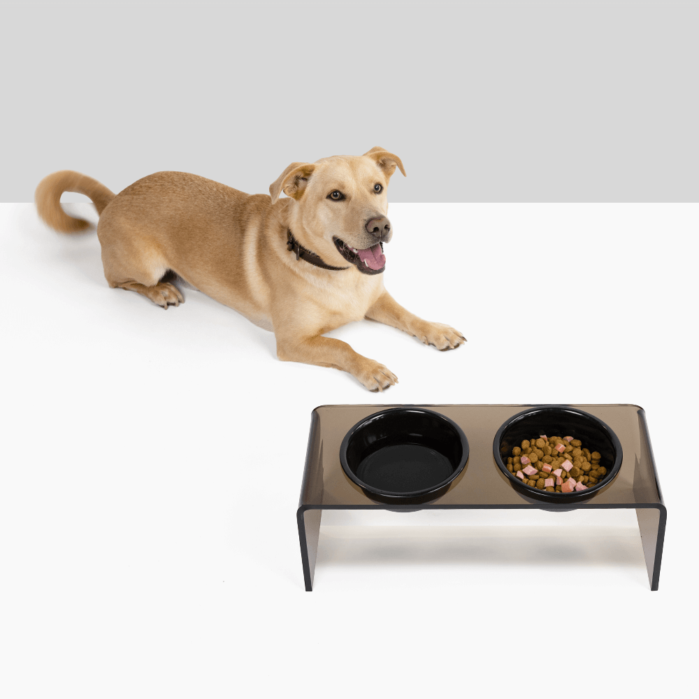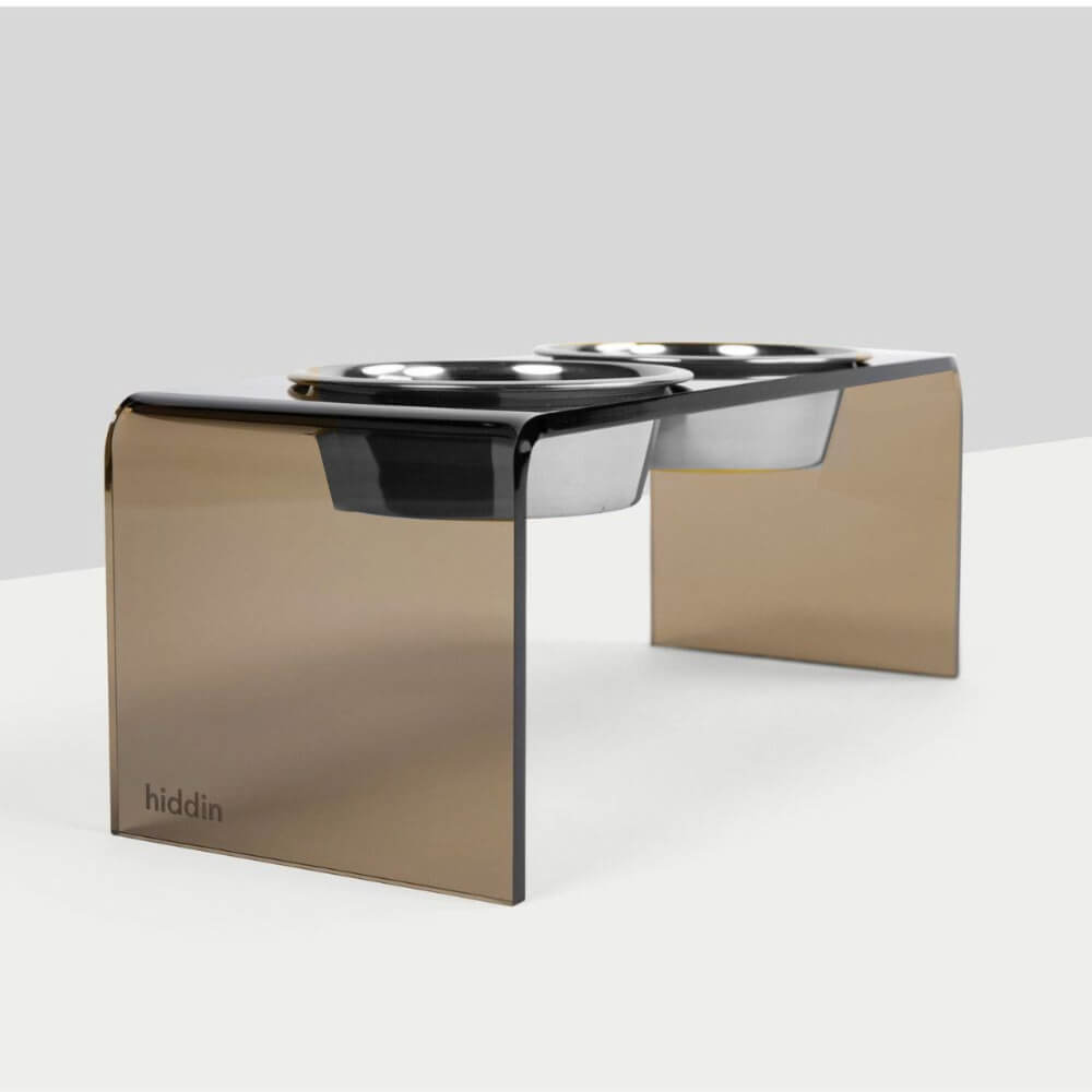 Our Medium Bronze Double Bowl Feeder is a modern brown lucite feeding stand with 3.5 cup stainless steel metal bowls. Our raised acrylic feeder is 7" tall and provides an ergonomically correct eating position for medium and large pets. With a gentle waterfall design, this sheer brown lucite double bowl feeder is sturdy and modern. Our exclusive, stainless steel bowls are available in silver, powder coated gold, white and black. All Hiddin bowls are non-toxic and weighty, adding shimmer and shine to your decor.