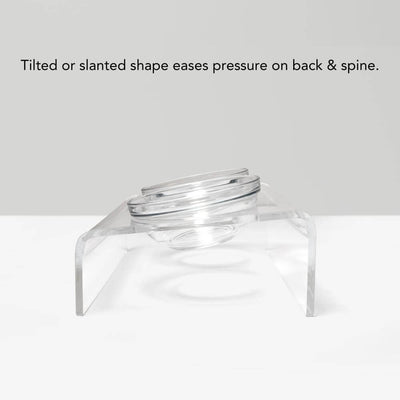 Our Clear Slanted Glass Bowl Feeder is elevated and angled, thereby reducing strain on your dog’s neck as they eat. Using Hiddin's highest quality lucite, we have designed just the right angle that makes getting every morsel of food so easy for your pet. Eating at an elevated angle can help prevent neck strain and joint pain, and has been shown to improves digestion.