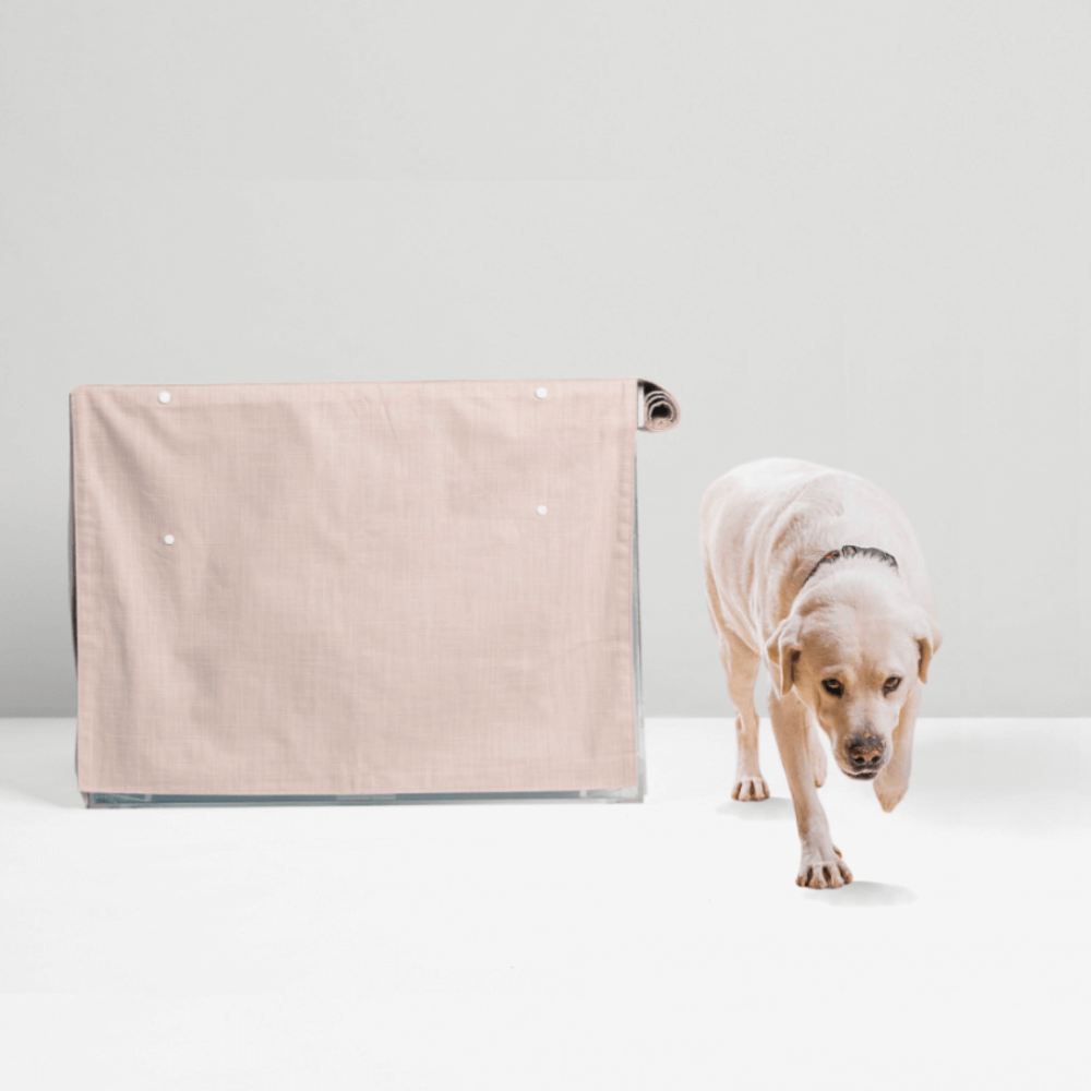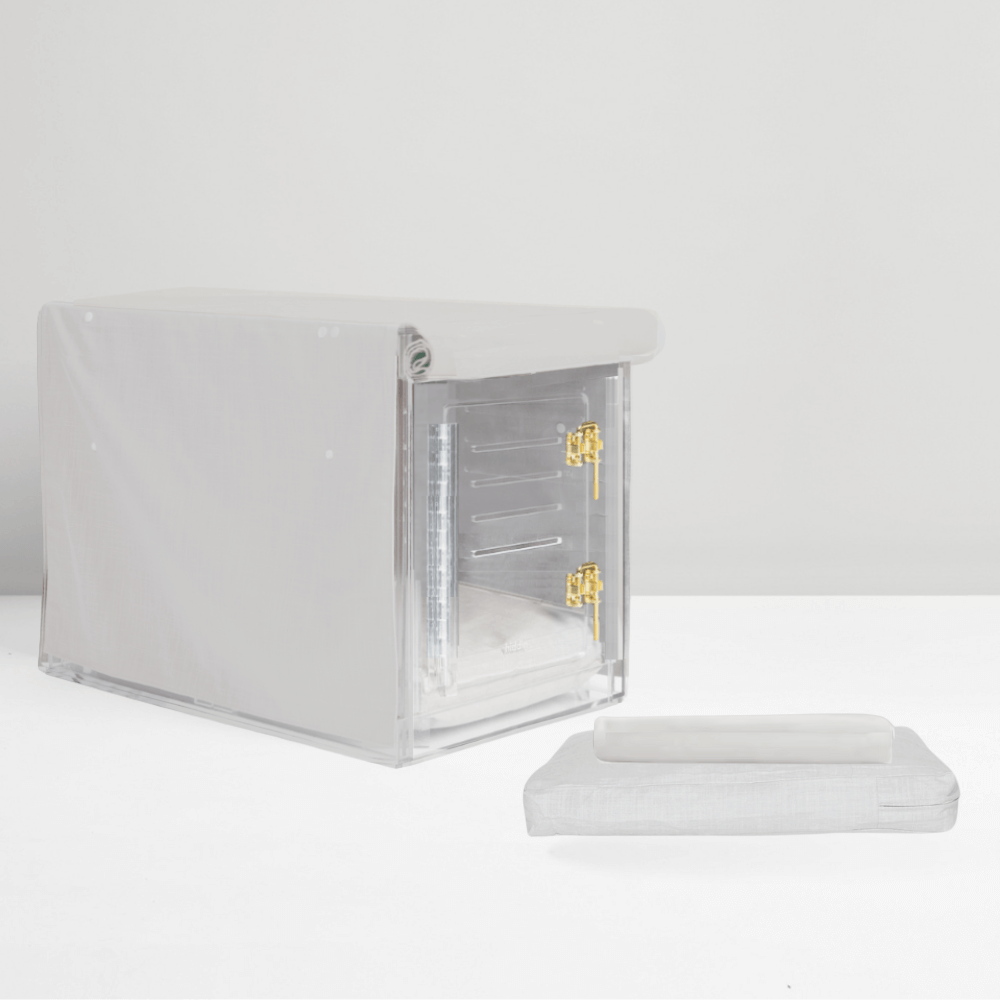 Introducing the Hiddin exclusive Crate Cover and Cushion Set that is as beautiful as it is functional. Our fitted cover and matching cushion features an easy-clean fabric made from premium upholstery-grade, basket weave cotton that is machine washable. The exclusive set is handmade in our US shop and is sized to fit the Hiddin Crate to Gate. The medium weight cotton fabric provides room darkening for sleep time; during relaxation time all 4 flaps can be rolled and secured with snap buttons, to provide fresh air and visibility.
