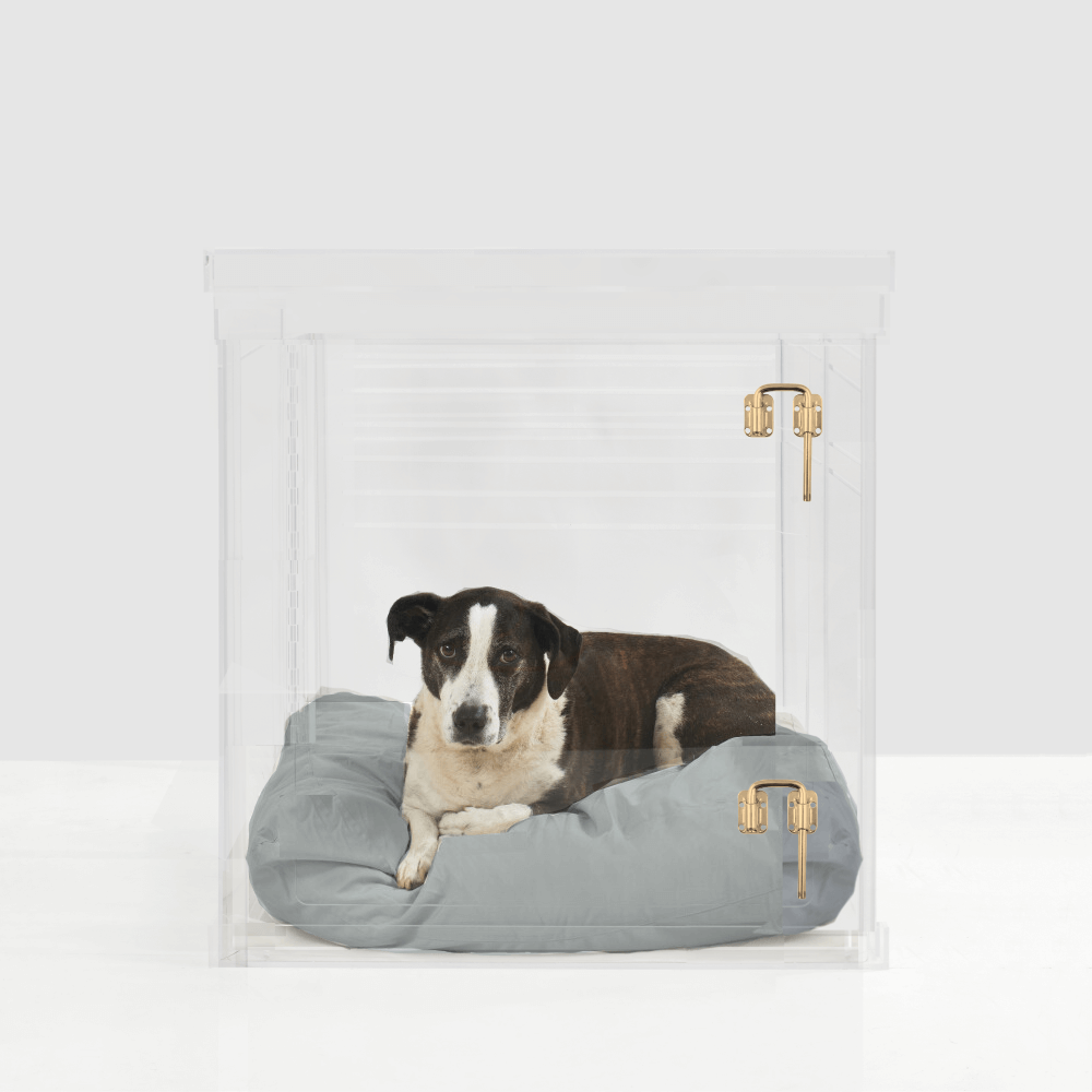 Clear Lucite pet products reduce pet anxiety because your pet has a clear view of you and the rest of the house.