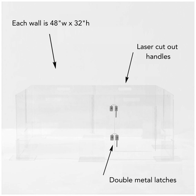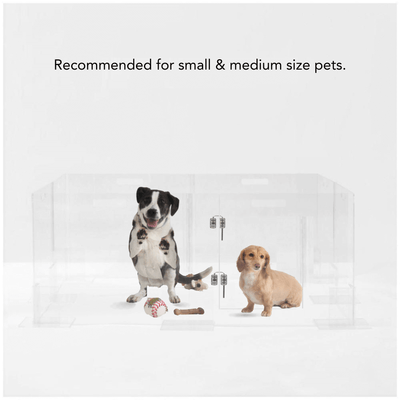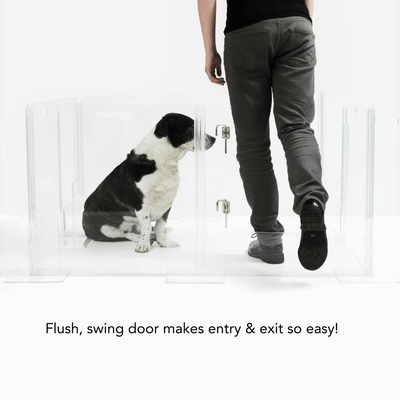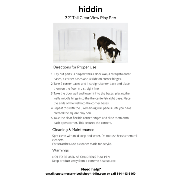 Inspired by the popularity of our Clear Pet Gate, Hiddin designed the only totally Clear Pet Playpen on the market! HIddin's 48" square playpen is an easy 10 minute set up with no tools required. An integrated, swing door with 2 metal latches, makes our playpen secure and safe. Each 32" high wall is hinged in the center, making this lucite pet playpen easy to break down and store away. Best of all, add-on walls are available to make it as large as you want!