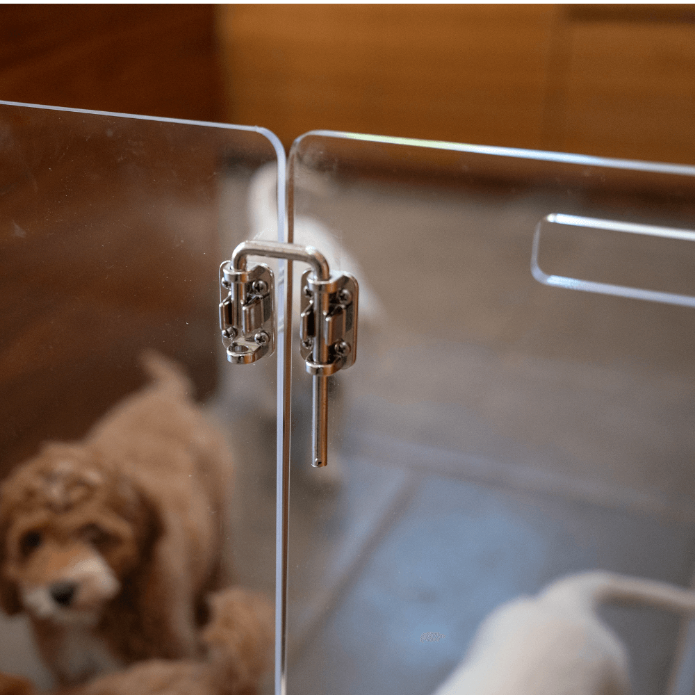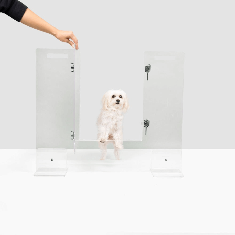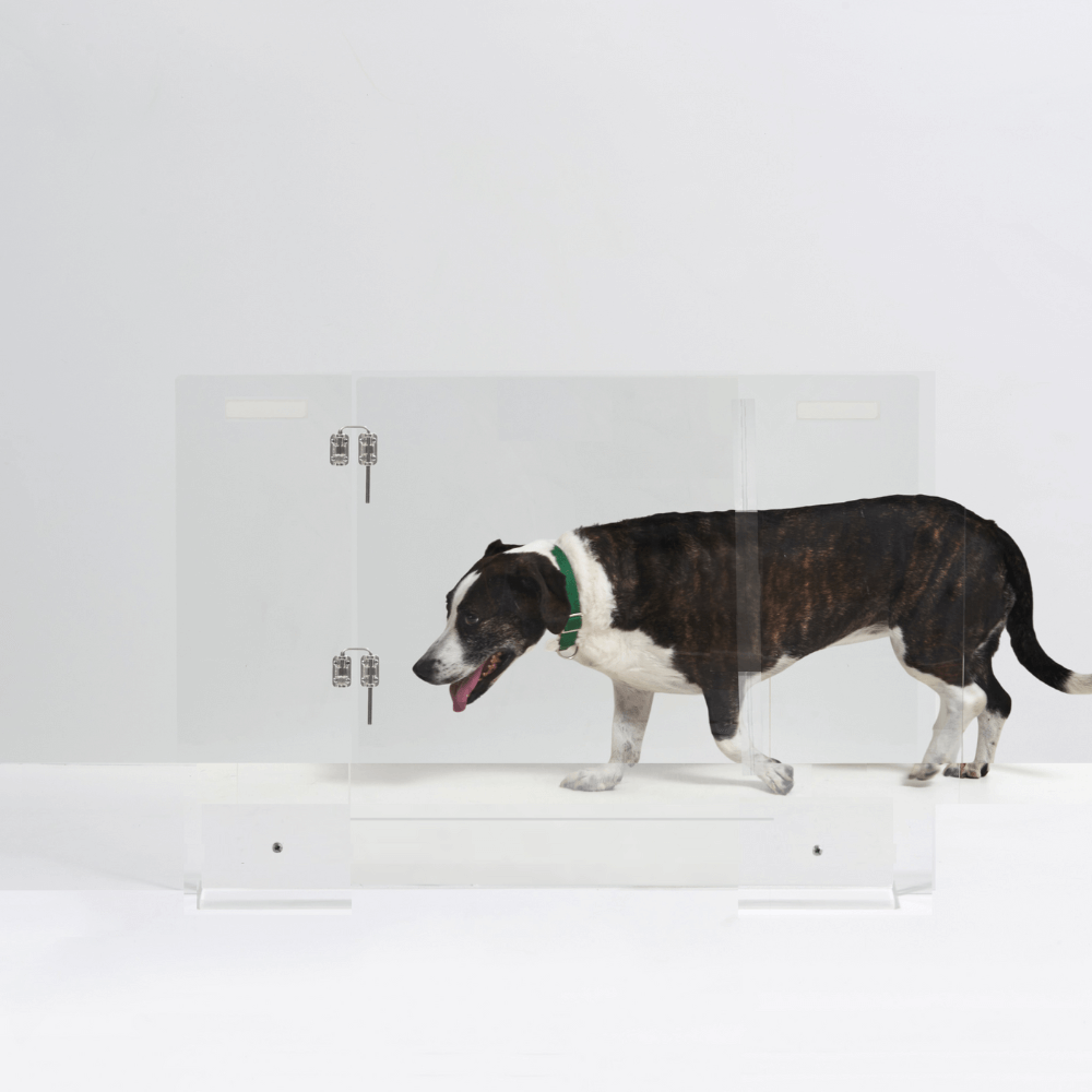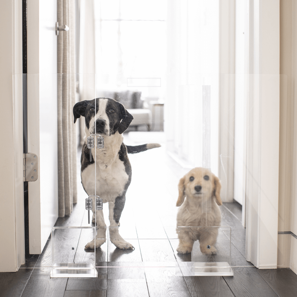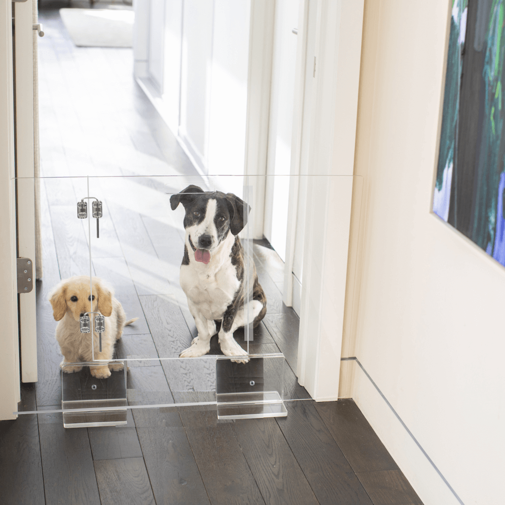 Our Clear Freestanding Pet Gate with Door is a clean, modern freestanding pet gate for openings 42" or less. This is the second generation of our View Panel Gate with a new, convenient, integrated swing door. The lucite pet gate consists of a 3/8" clear acrylic panel that slides into two, T shaped, clear feet. Two stainless steel metal latches secure the flush door and add just a little bit of sparkle. This freestanding pet gate is pure modernity. Each clear view pet gate is handmade in the USA and comes with adhesive floor protectors.