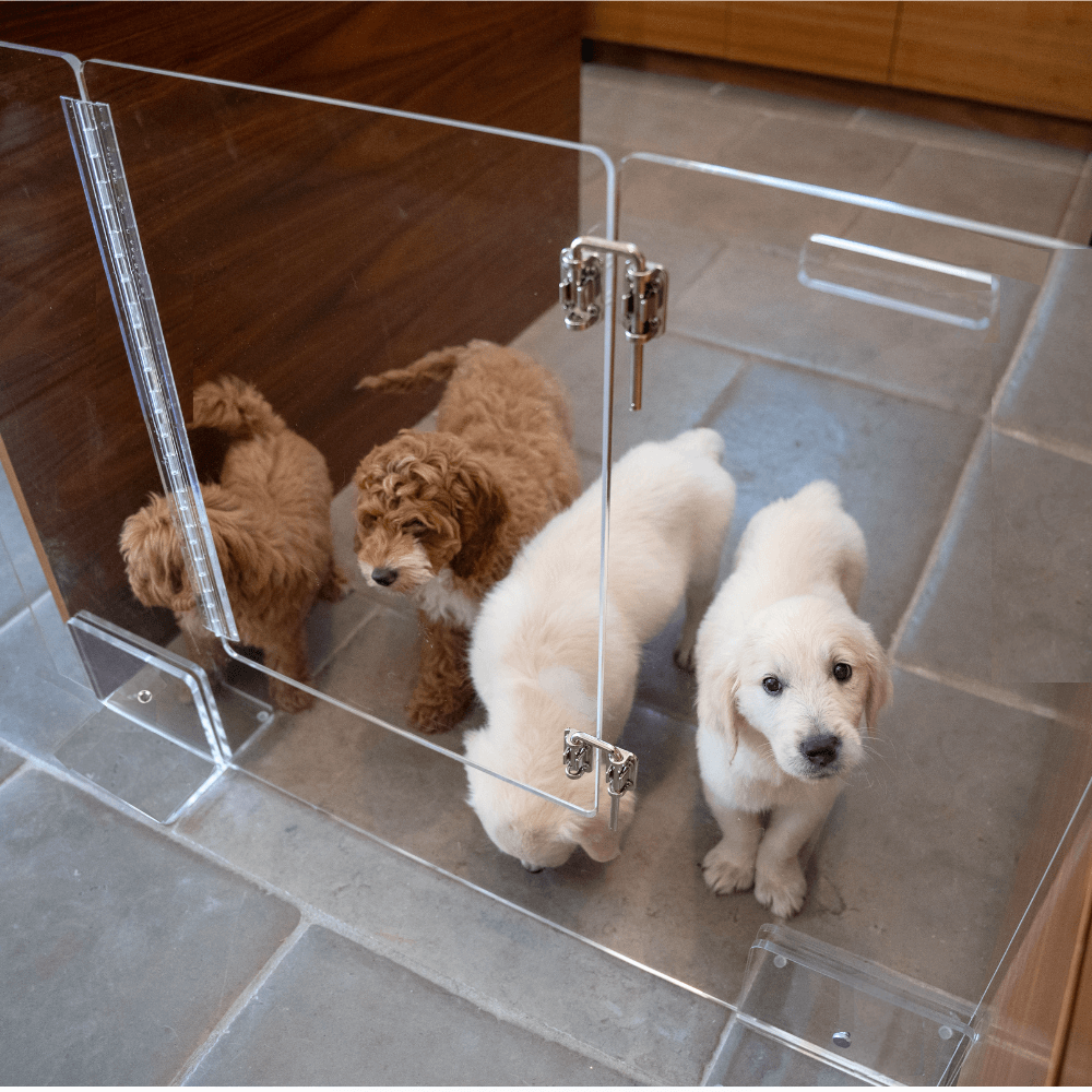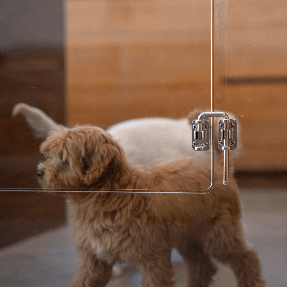 Clear Lucite pet products reduce pet anxiety because your pet has a clear view of you and the rest of the house.