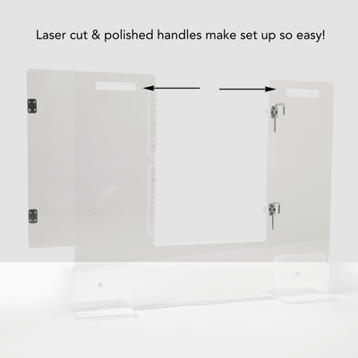 -Slide panel into 2 clear feet, tighten the feet to the panel with provided screws. One screw for each foot. (Note: The screw tightens to the panel but does not go through the panel.