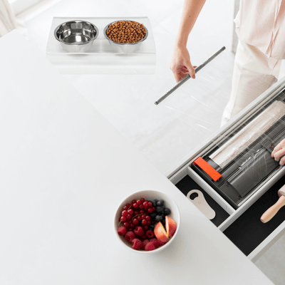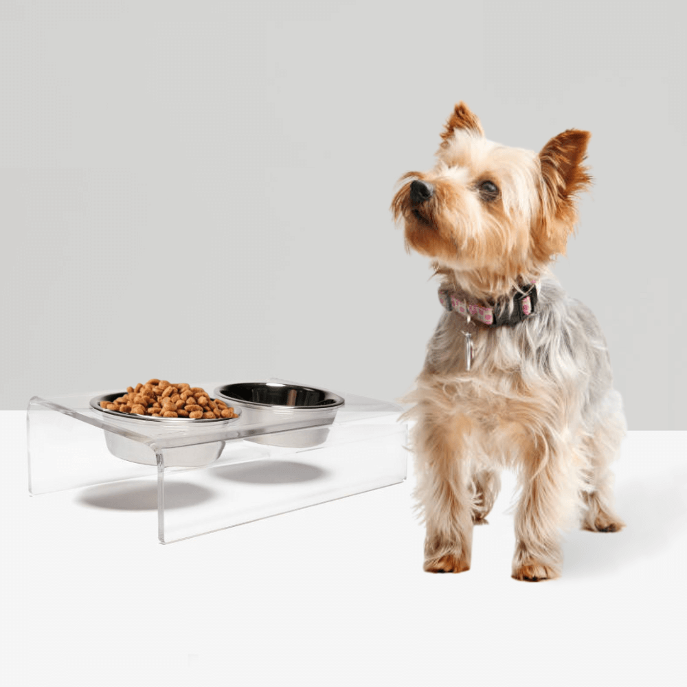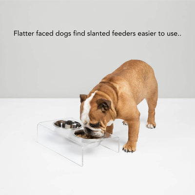 Our Clear Slanted Silver Bowl Feeder is elevated at an angle, thereby reducing strain on your dog’s neck as they eat. Using Hiddin's highest quality lucite, we have designed just the right angle that makes getting every morsel of food so easy for your pet. Eating at an elevated angle can help prevent neck strain and joint pain, and has been shown to improves digestion. HIddin's slanted acrylic feeder is available with your choice of 2 bowl sizes; 3.5 cup or 6.5 cup. Our silver bowls are food safe, non-toxic and dishwasher safe. Angled dog feeders, also known as tilted or slanted feeders can be especially beneficial for dogs with neck or back issues, such as those recovering from surgery or suffering from arthritis.