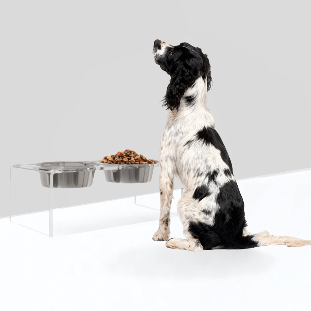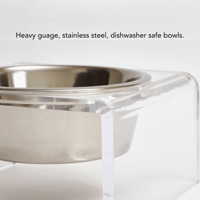 Our Medium Clear Double Pet Feeder with Silver Bowls is a modern 3/8" thick lucite feeding stand with 2 stainless steel metal bowls. Our exclusive stainless steel bowls are lead free, dishwasher safe and non-toxic. The 7" high acrylic feeder provides an ergonomically correct eating position and gives the sleek metal bowls a floating effect. With a gentle waterfall design, this clear lucite pet feeder is sturdy and modern.