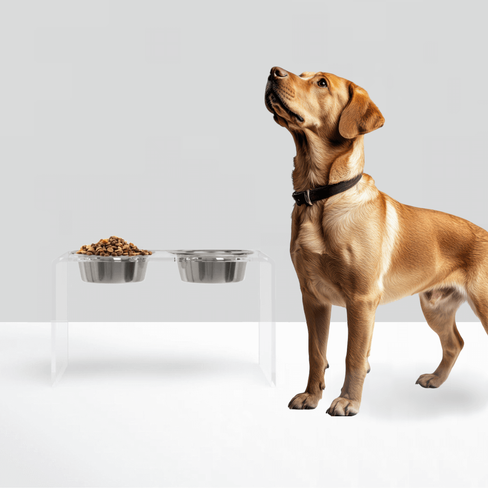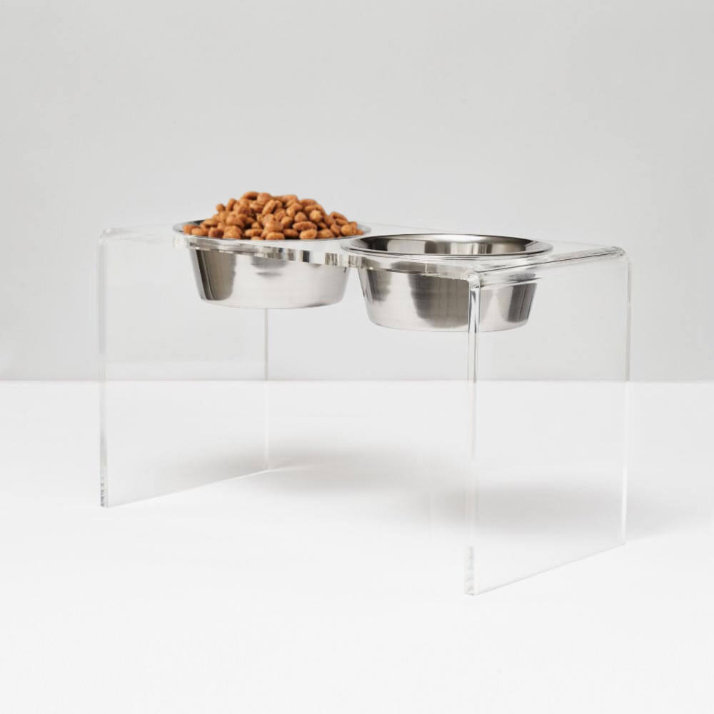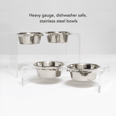 Our Tall Clear Double Pet Bowl Feeder with Silver Bowls is a chic choice for large dog dining. The 1/2" thick acrylic provides the strength, while the 12" height ensures an ergonomically correct eating position for your large pet. This tall lucite dog bowl feeder includes 2 lead free, dishwasher safe 6.5 cup stainless steel bowls.