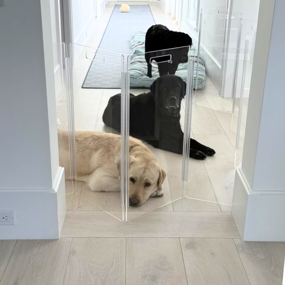 Clear Lucite pet products reduce pet anxiety because your pet has a clear view of you and the rest of the house.