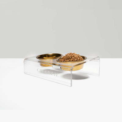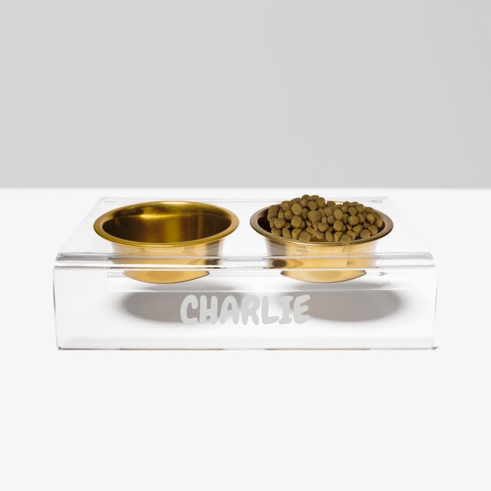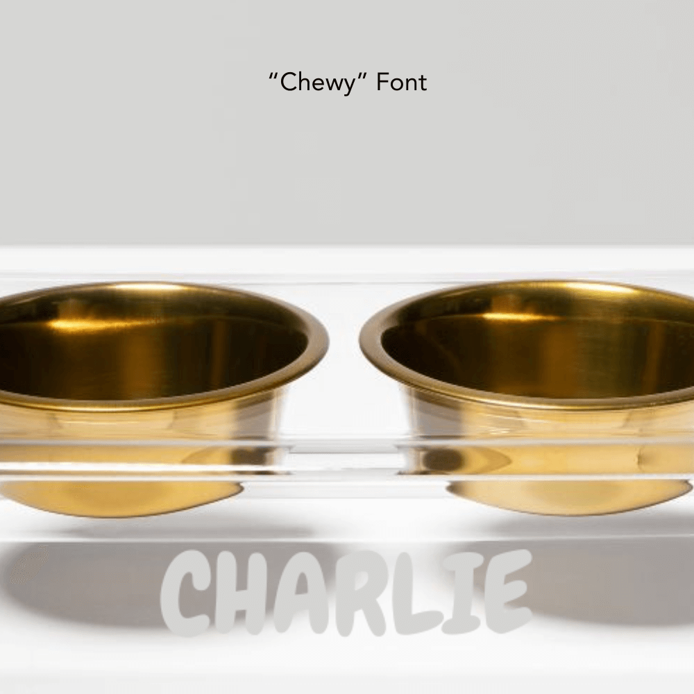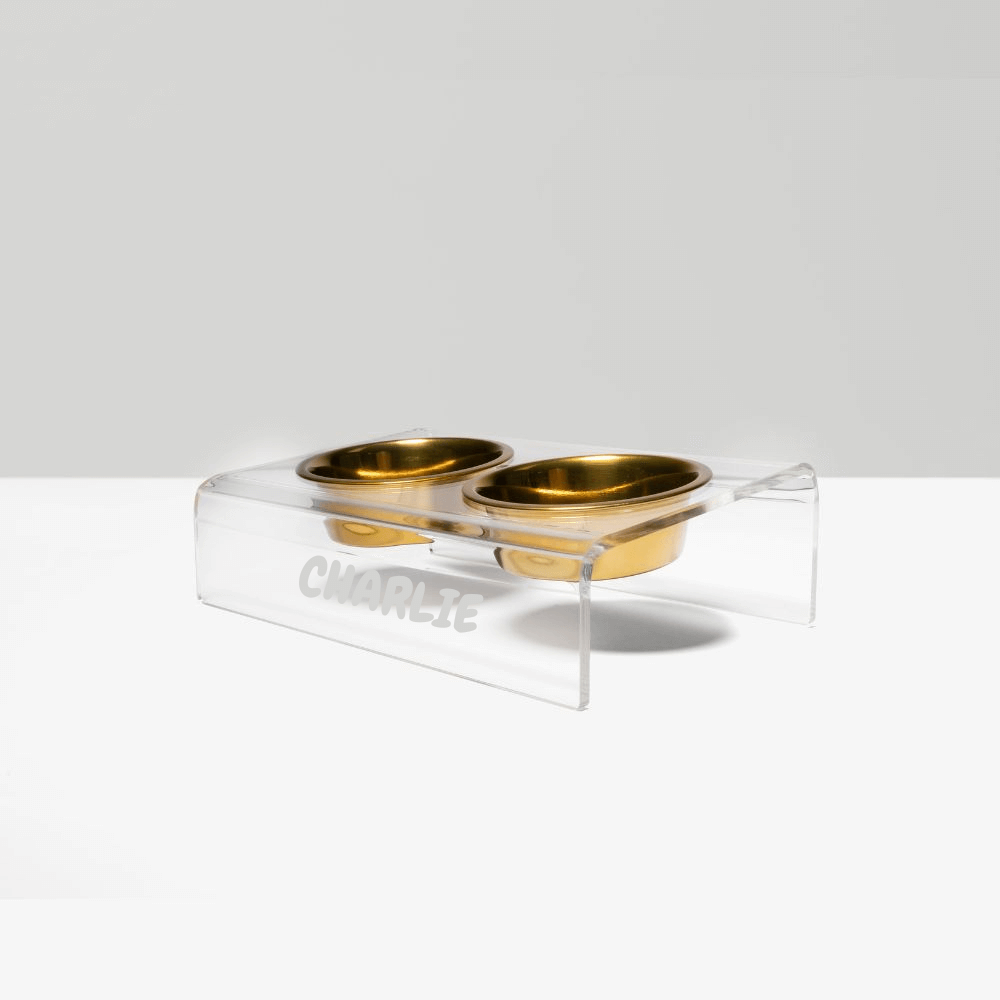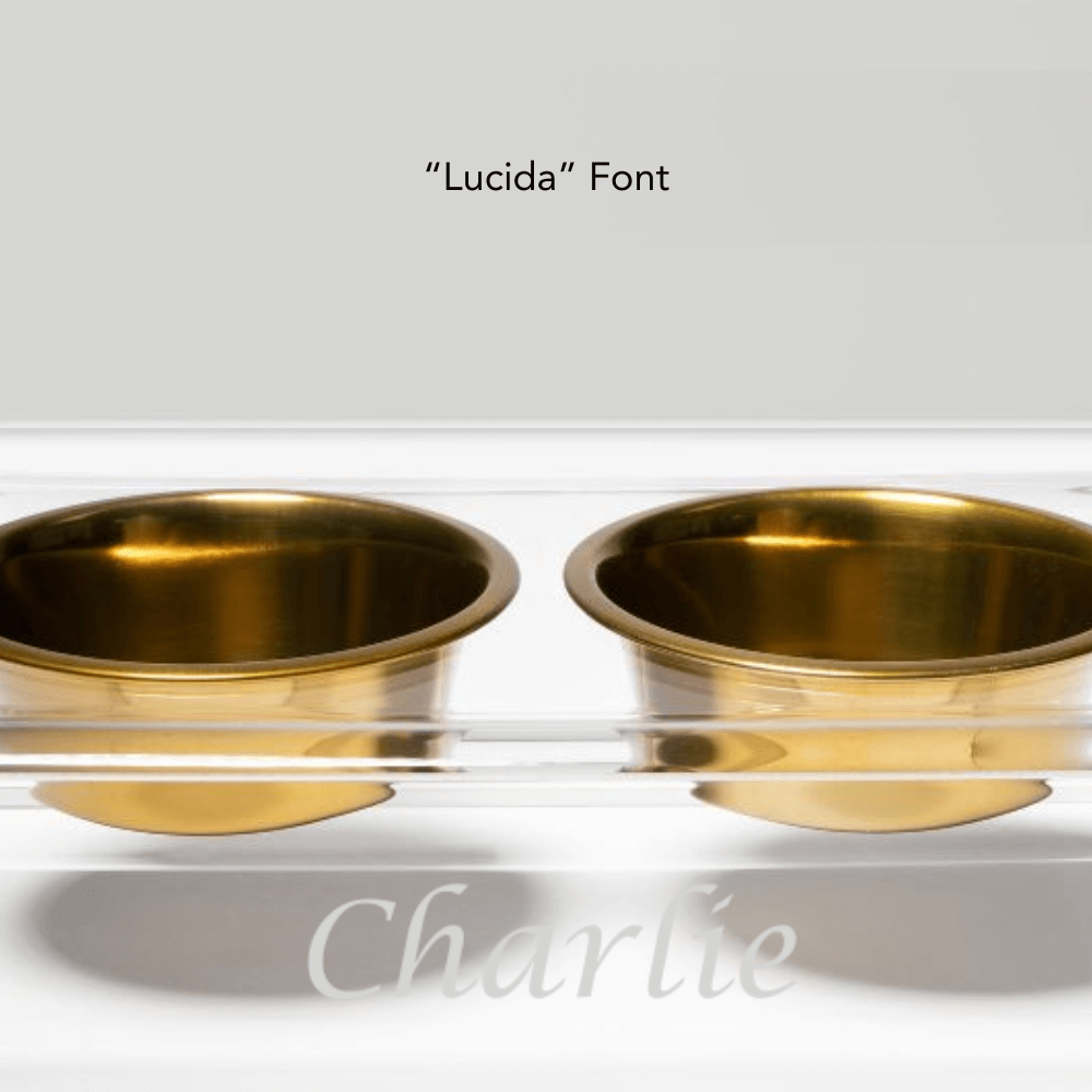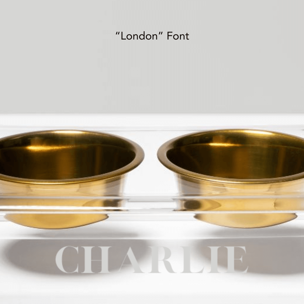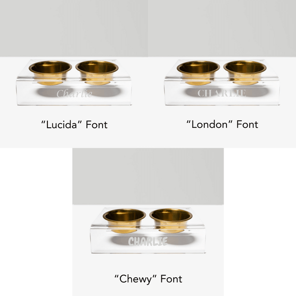 Our Personalized Slanted Gold Bowl Feeder is elevated at an angle, thereby reducing strain on your dog’s neck as they eat. Here's your opportunity to make it your own with your pet's engraved name on the front! Choose from 3 elegant fonts and the result is pure love. Using hiddin's highest quality lucite, we have designed just the right angle that makes getting every morsel of food so easy for your pet. Eating at an elevated angle can help prevent neck strain and joint pain, and has been shown to improves digestion. HIddin's slanted acrylic feeder is available with your choice of 2 gold bowl sizes; 1 quart or 2 quart bowls. Our gold bowls are food safe, non-toxic and hand wash only. Angled dog feeders, also known as tilted or slanted feeders can be especially beneficial for dogs with neck or back issues, such as those recovering from surgery or suffering from arthritis.