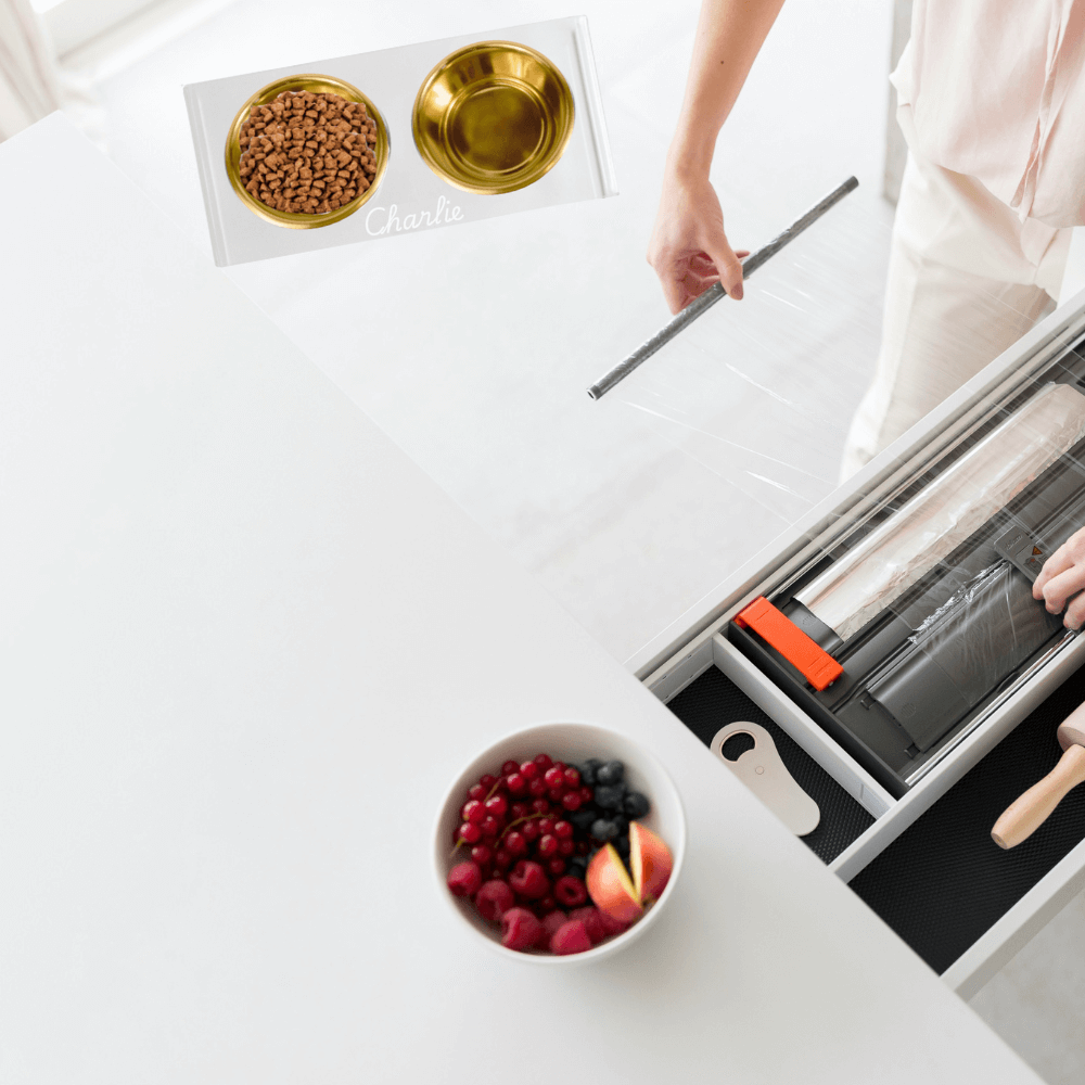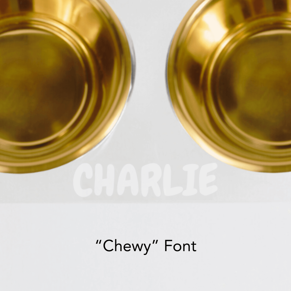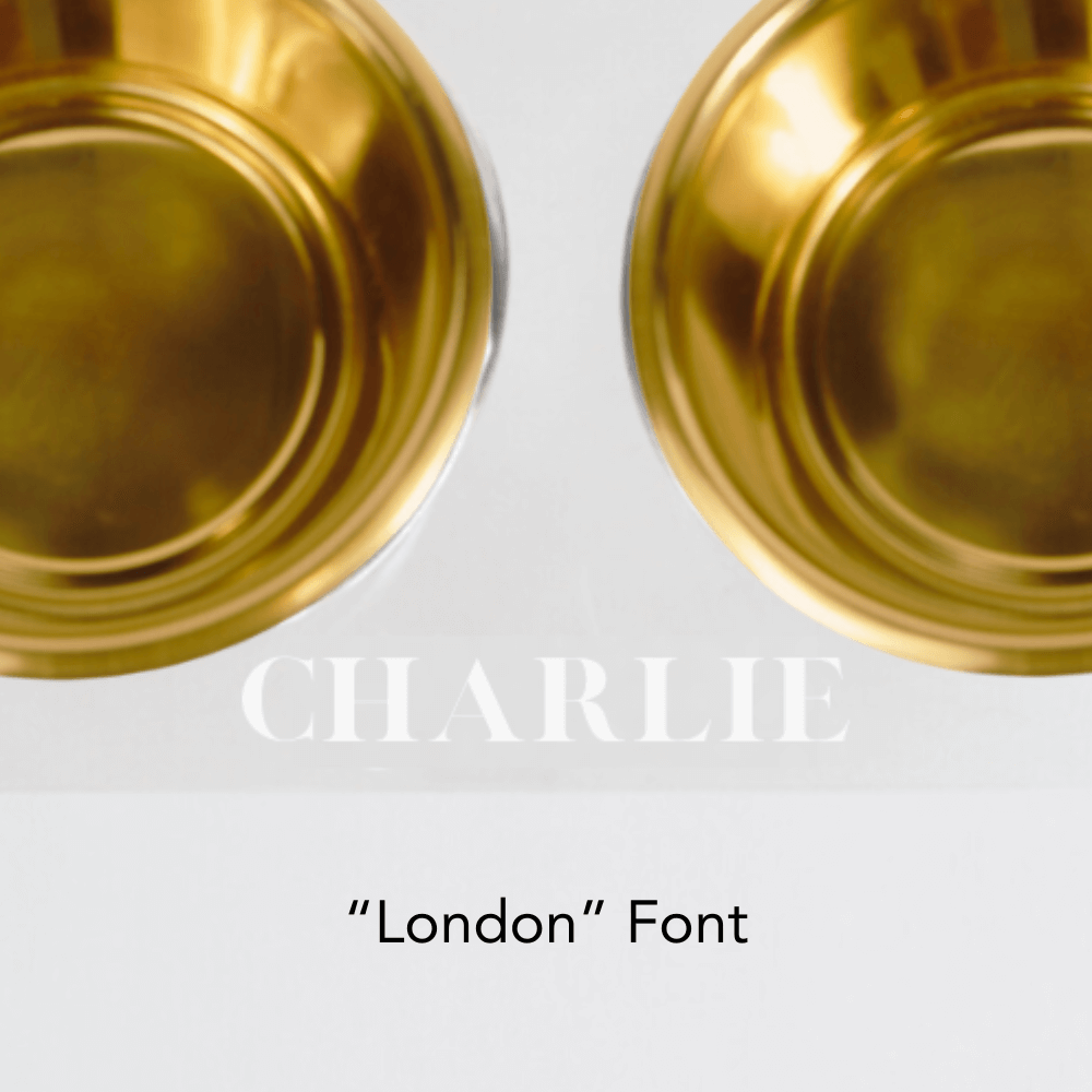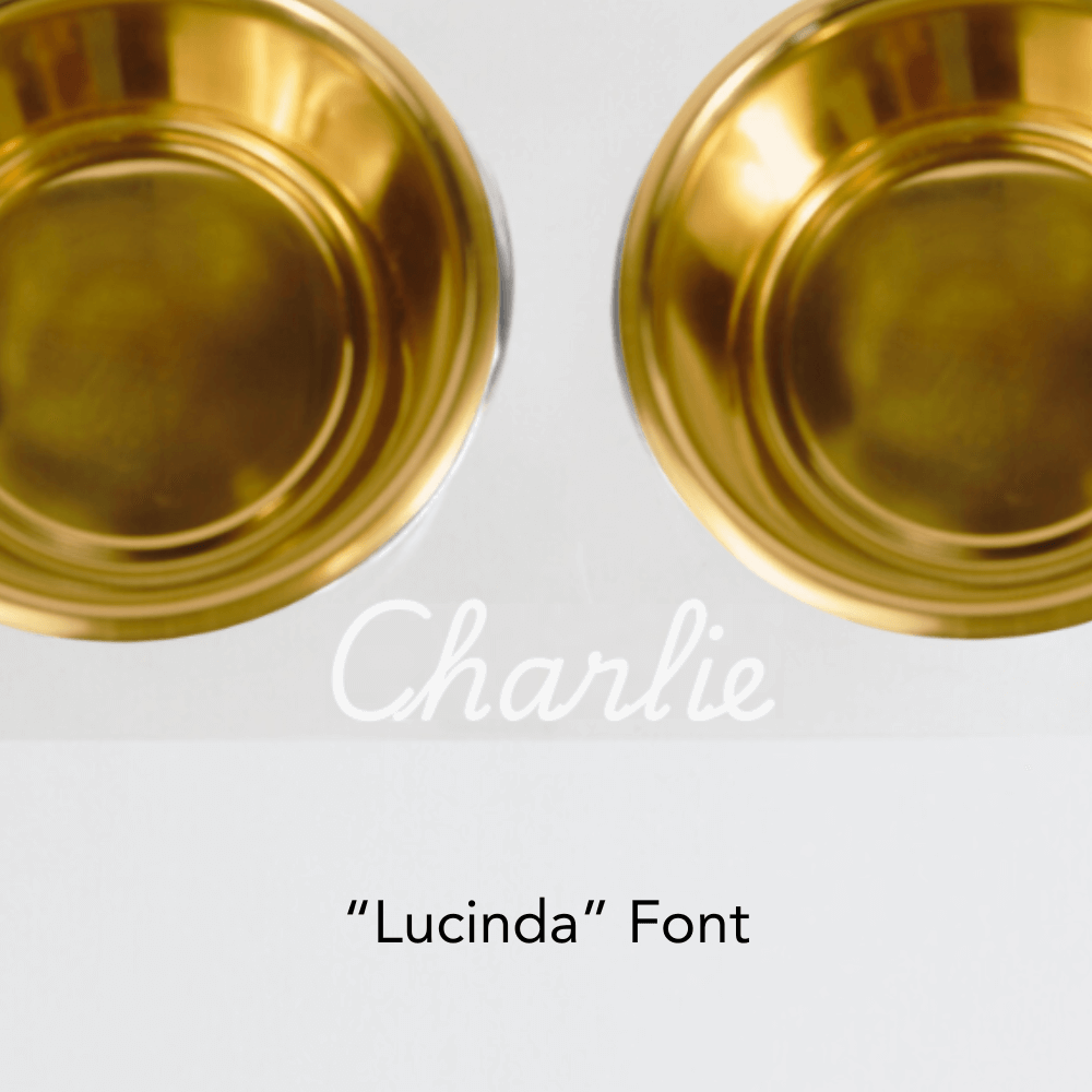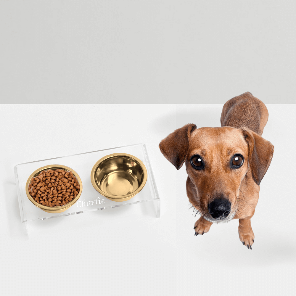 Our Monogram Double Feeder is a modern, thick Lucite pet feeder with 2 lead free, stainless powder coated, gold metal bowls. The exclusive gold metal bowls are non-toxic, food safe and hand wash only. Designed for dogs of all sizes, the Hiddin clear lucite feeders are now available with the option to engrave your pet's name! Just choose one of our 3 favorite fonts and make your lucite feeder special. With a gentle waterfall design, this clear lucite pet feeder is sturdy and modern and blends into any decor. Allow 3 weeks for production....elegance awaits!