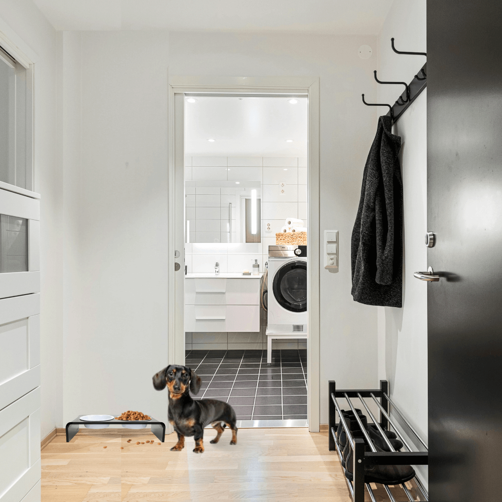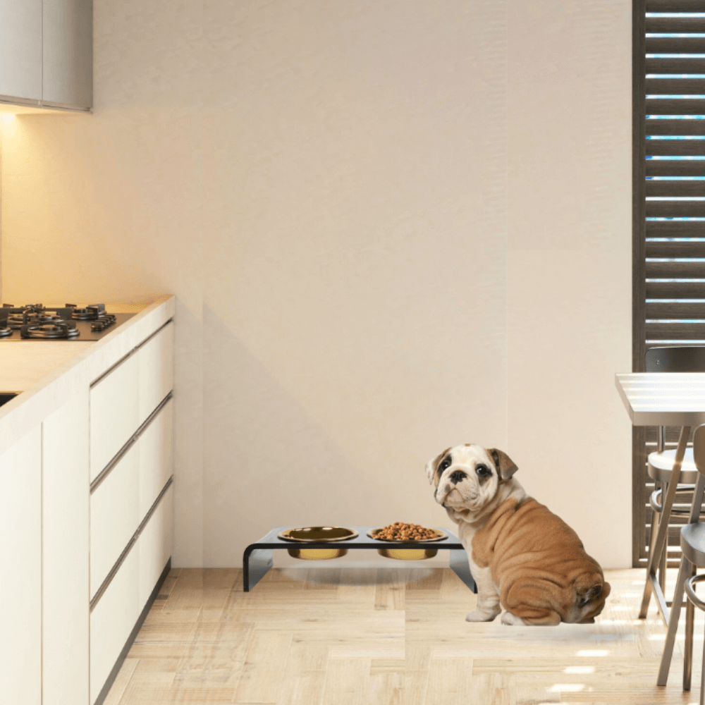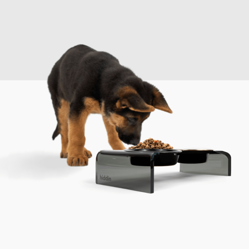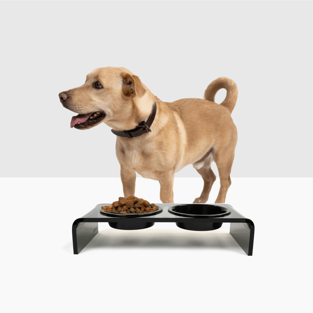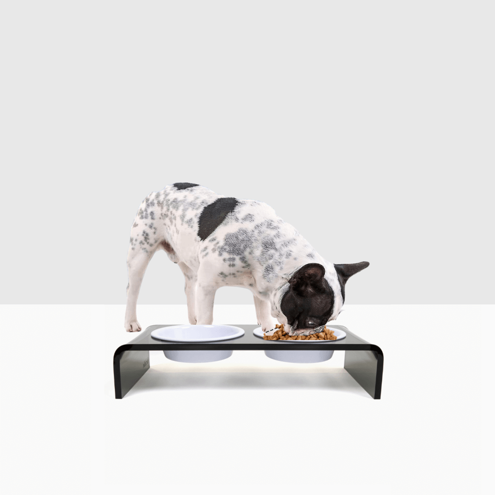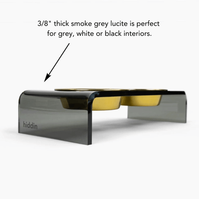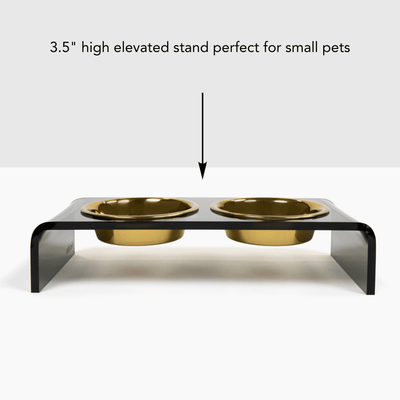 Our Small Smoke Grey Double Bowl Feeder is a modern smoke grey lucite feeding stand with stainless steel metal bowls. Our raised acrylic feeder is 3.5" tall and provides an ergonomically correct eating position for smaller pets. With a gentle waterfall design, this sheer grey lucite double bowl feeder is sturdy and modern. Our exclusive metal bowls have a 1.5 cup capacity and come in white, black, gold and stainless silver. The color bowls are hand wash only and the stainless silver is dishwasher safe. All of our bowls are non-toxic, lead free and weighty, adding shimmer and shine to your decor.