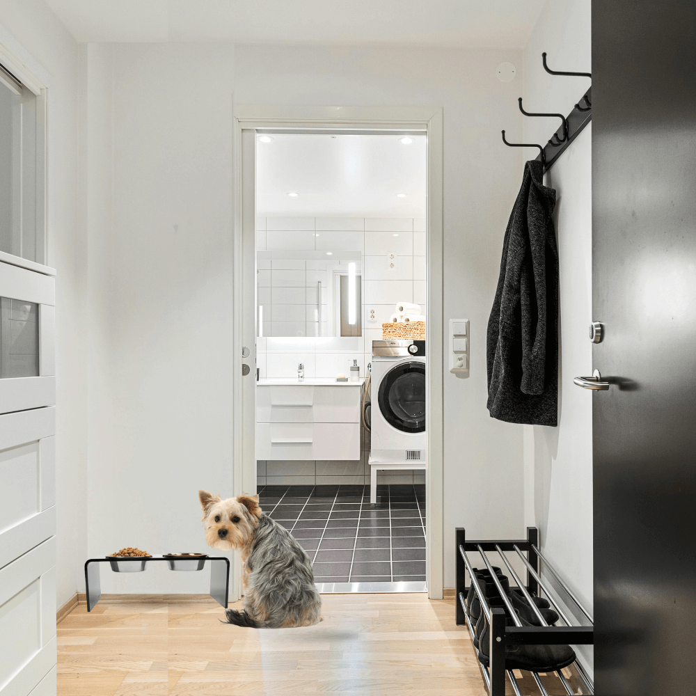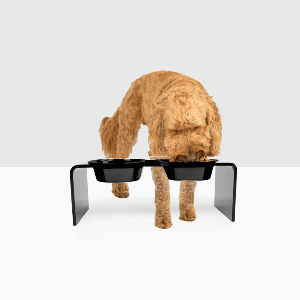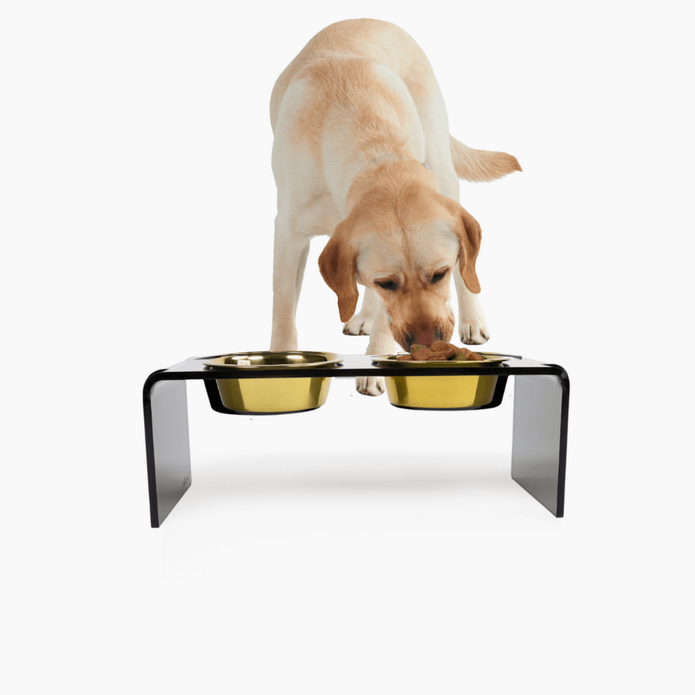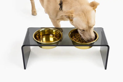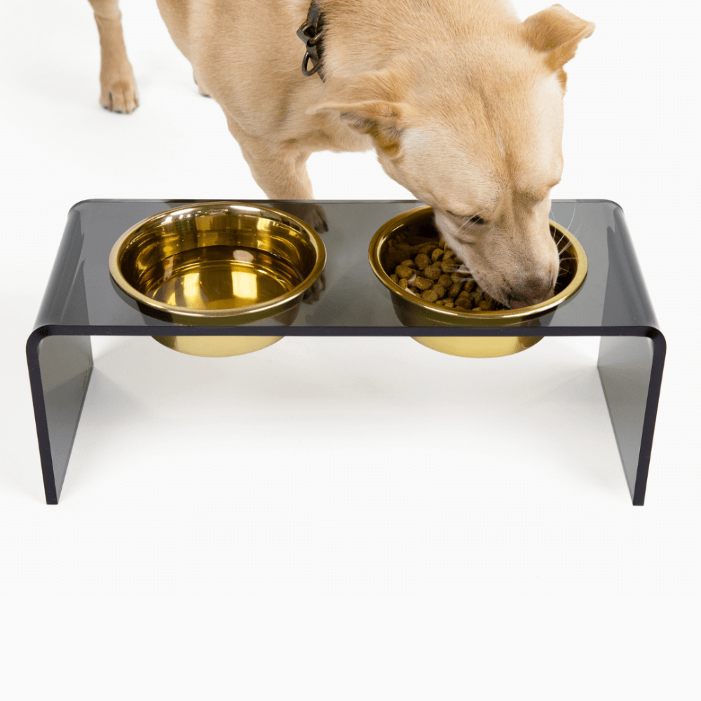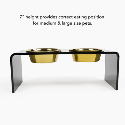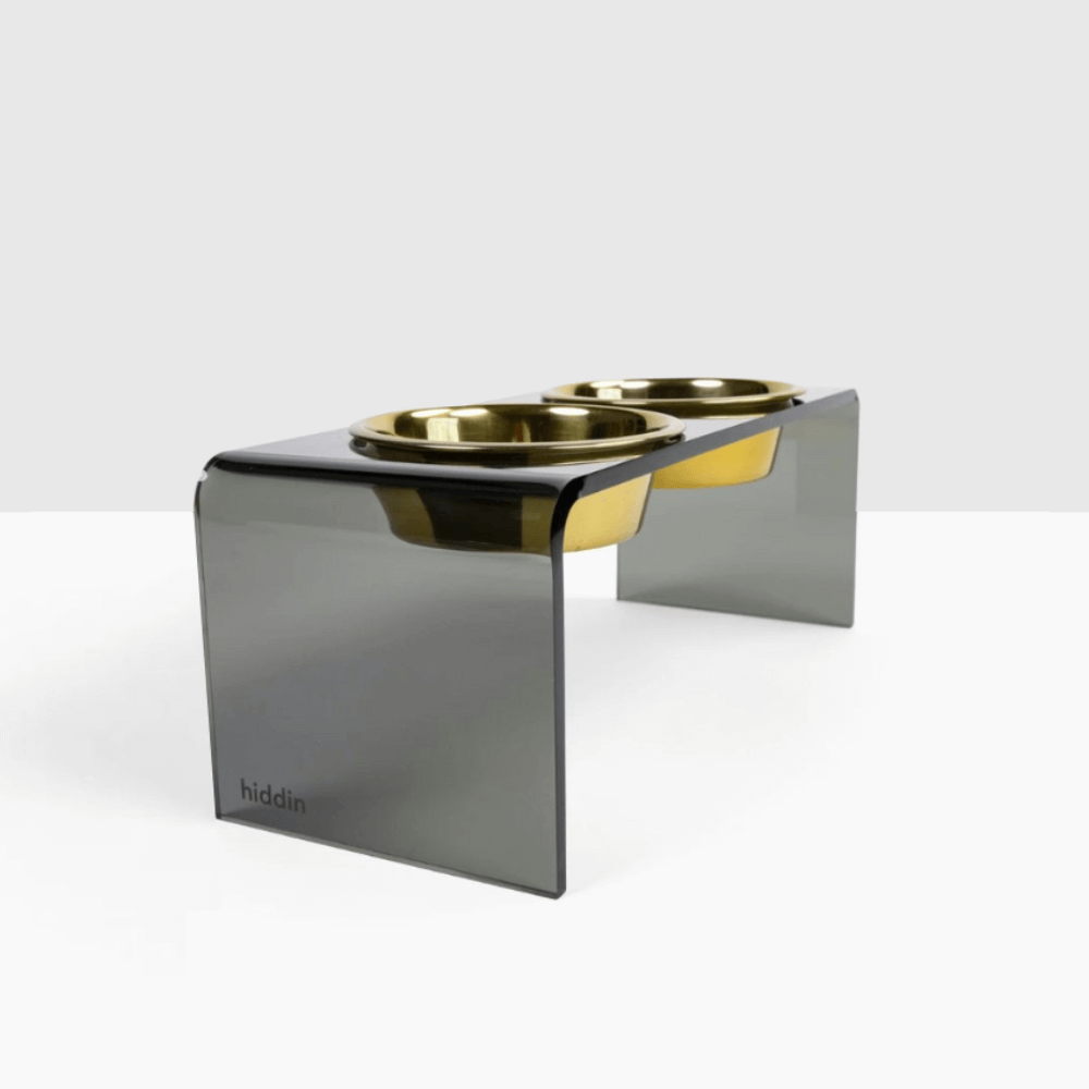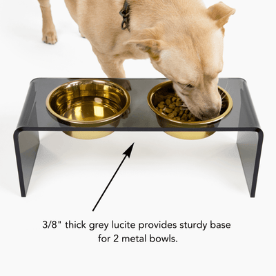 Our Medium Smoke Grey Small Double Bowl Feeder is a modern grey lucite feeding stand with 3.5 cup, stainless steel metal bowls. Our raised acrylic feeder is 7" tall and provides an ergonomically correct eating position for medium and large size pets. With a gentle waterfall design, this dark grey lucite double bowl feeder is sturdy and modern. Our exclusive bowls are available in stainless steel silver and powder coated white, black and gold. The Hiddin bowls are non-toxic, lead-free and weighty, adding shimmer and shine to your decor. The stainless silver bowls are dishwasher safe while the color bowls are hand wash only.