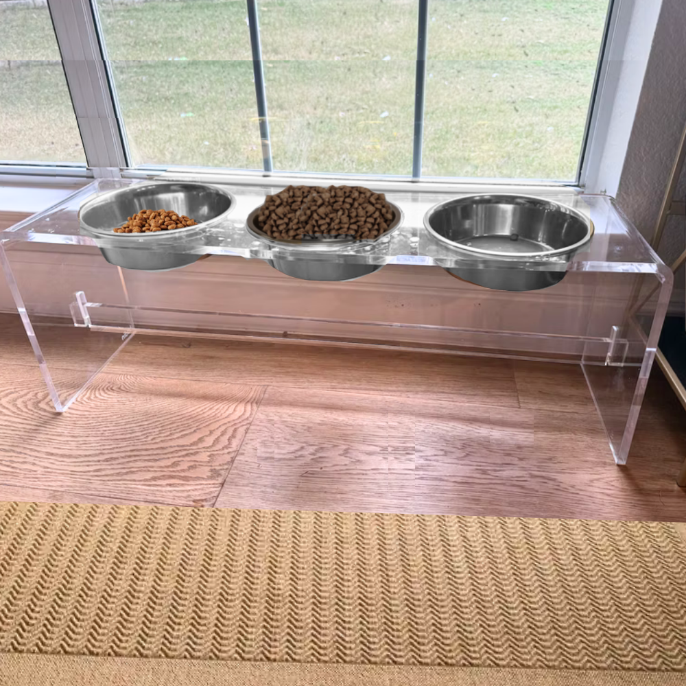 Clearly, this is the best looking, lucite 3 bowl feeder and is made in the USA, under our watchful eye.