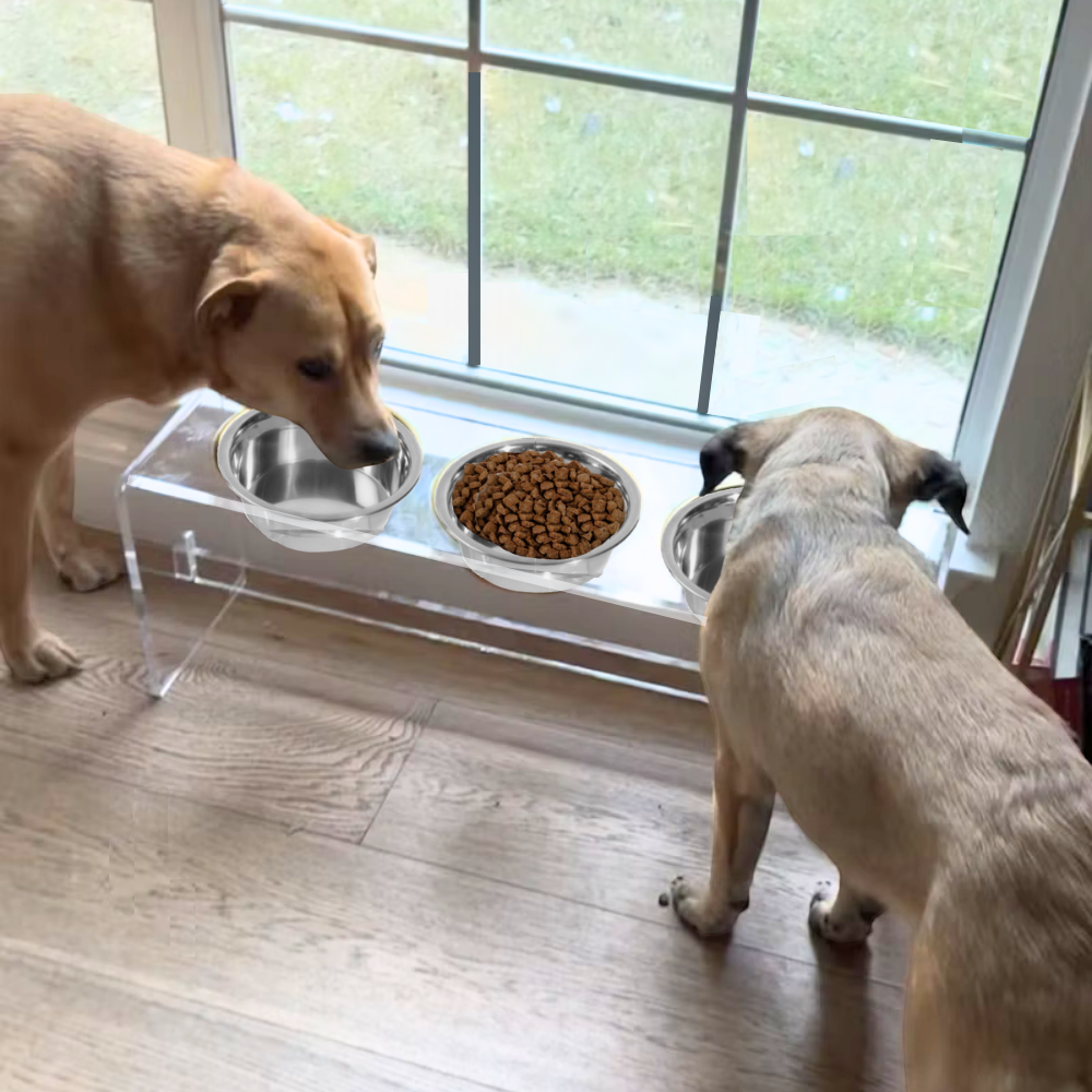 Our Tall Clear Triple Dog Bowl Feeder with Silver Bowls is a chic choice for multiple dogs' dining. The 1/2" thick acrylic provides the strength, while the 12" height ensures an ergonomically correct eating position for your pets. A practically invisible, matching lucite crossbar can be used to prevent bowing. Depending on the weight of your bowl contents, you can choose to use the stretcher or not. Each bowl has a 6.5 cup capacity and bowls are lead free, non-toxic and dishwasher safe.