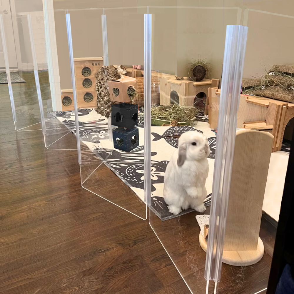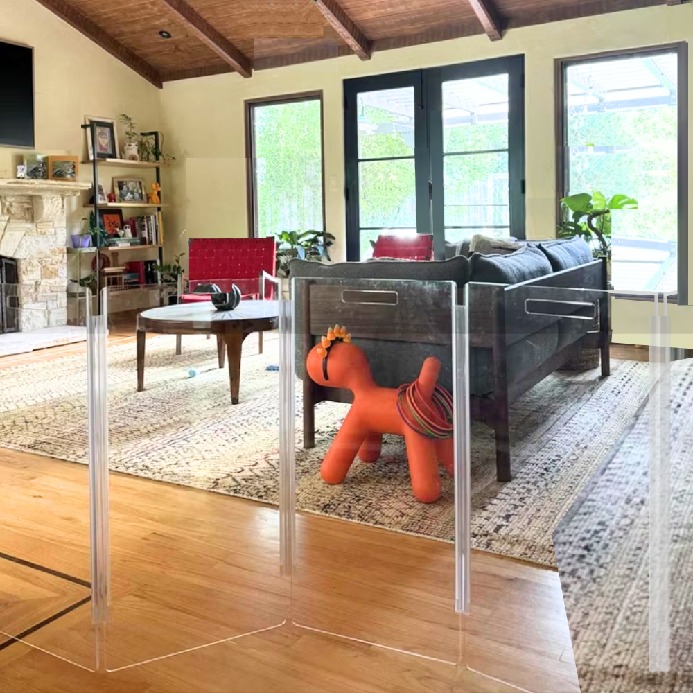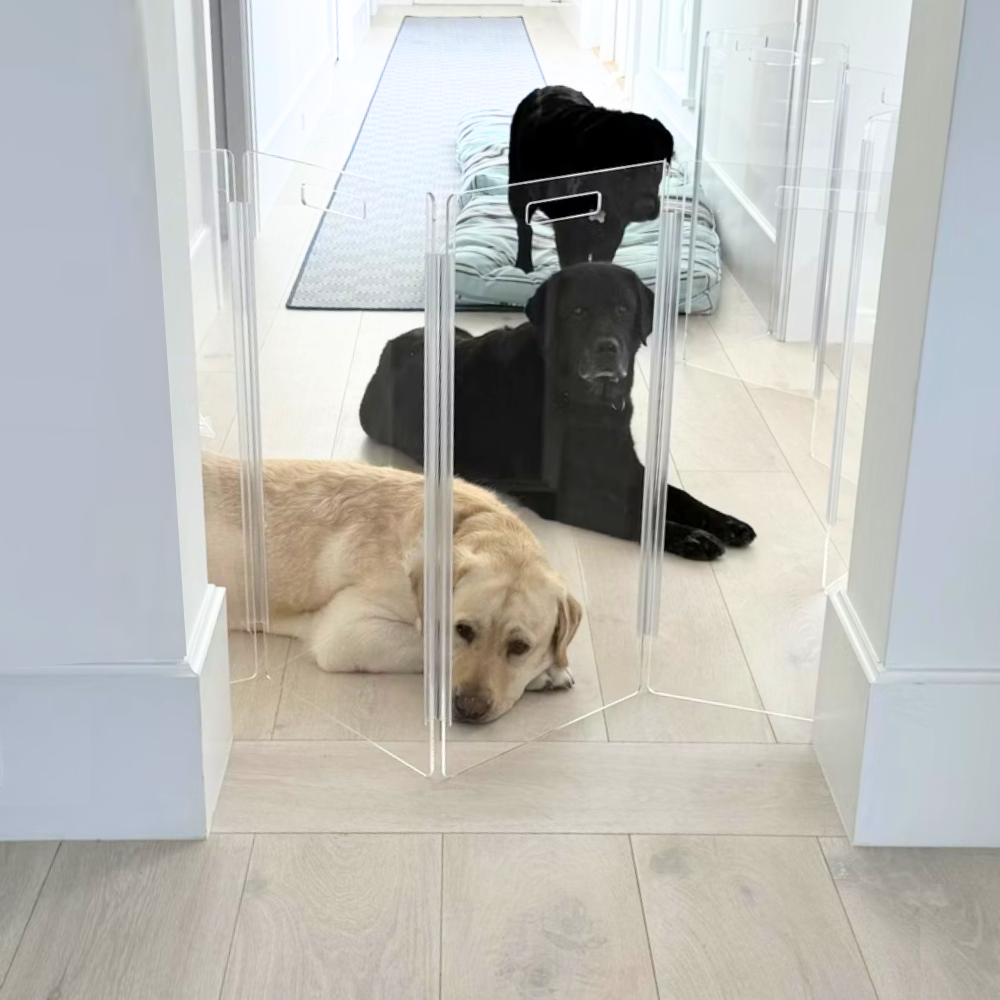 Clear Lucite pet products reduce pet anxiety because your pet has a clear view of you and the rest of the house.