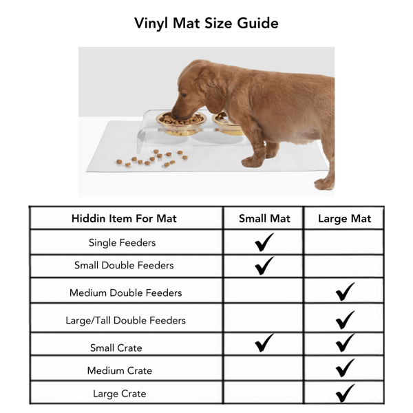 The small size mat accommodates our single and small double feeders and the large is perfect for our medium, tall double and triple pet feeders. Our protective mats can also be used under our clear dog crates! Your mat will come rolled so place it on the floor and give it time to relax and flatten.
