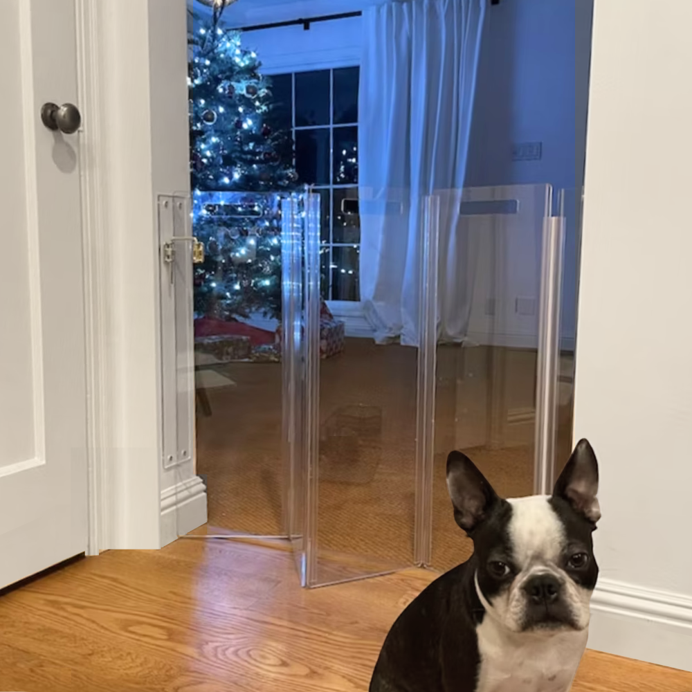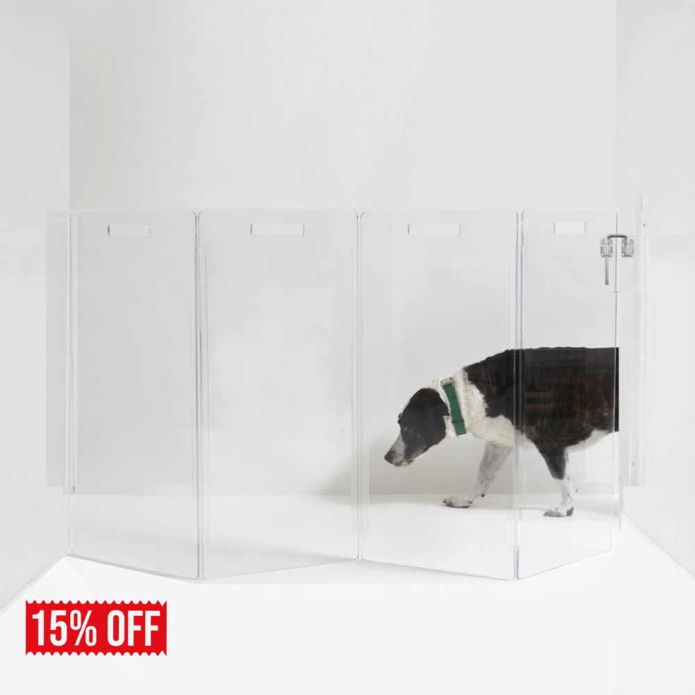 Clear Lucite pet products reduce pet anxiety because your pet has a clear view of you and the rest of the house.