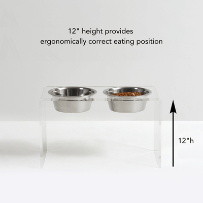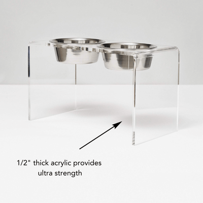 Our Tall Clear Double Pet Bowl Feeder with Silver Bowls is a chic choice for large dog dining. The 1/2" thick acrylic provides the strength, while the 12" height ensures an ergonomically correct eating position for your large pet. This tall lucite dog bowl feeder includes 2 lead free, dishwasher safe 6.5 cup stainless steel bowls.